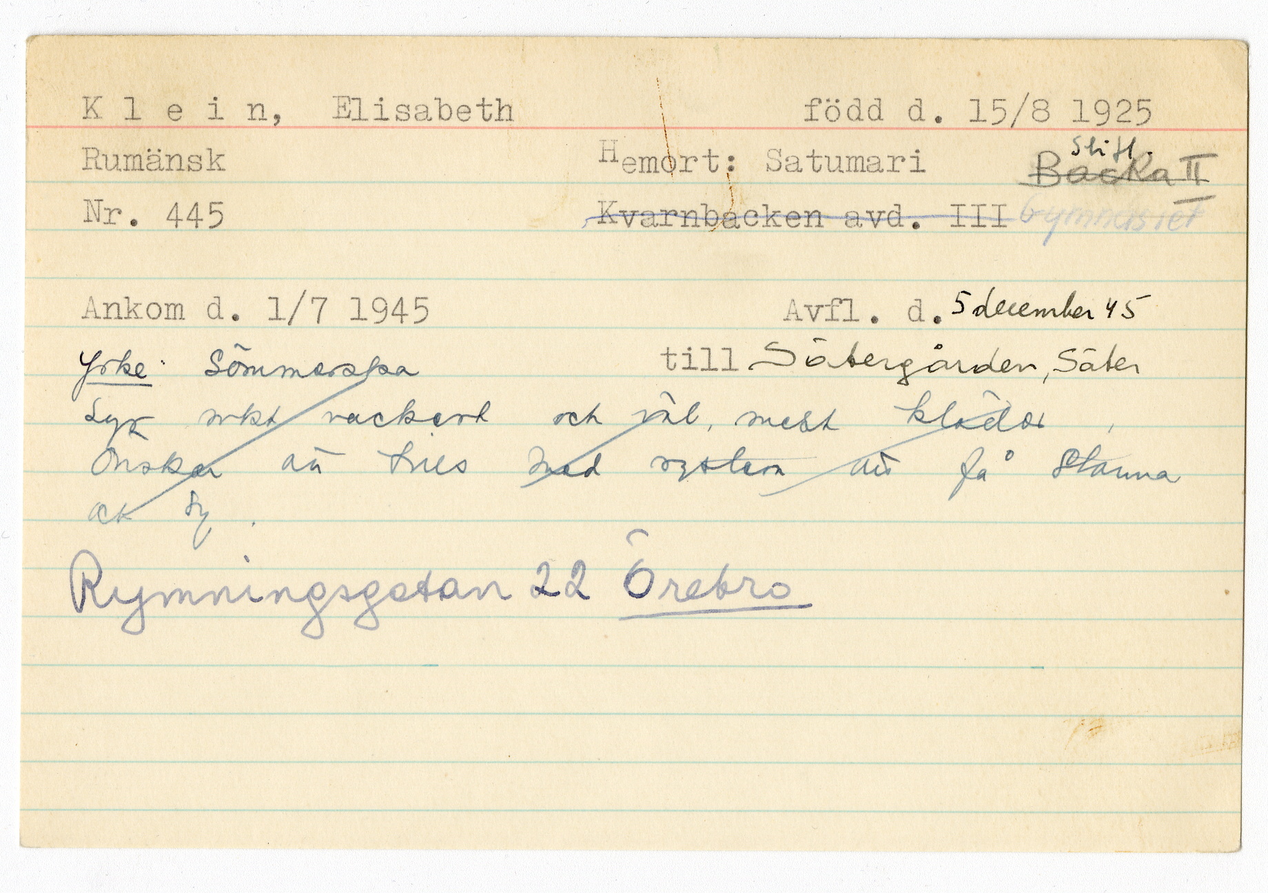 Ett skrivkort med patientuppgifter gällande Elisabeth Klein (1925-08-15).