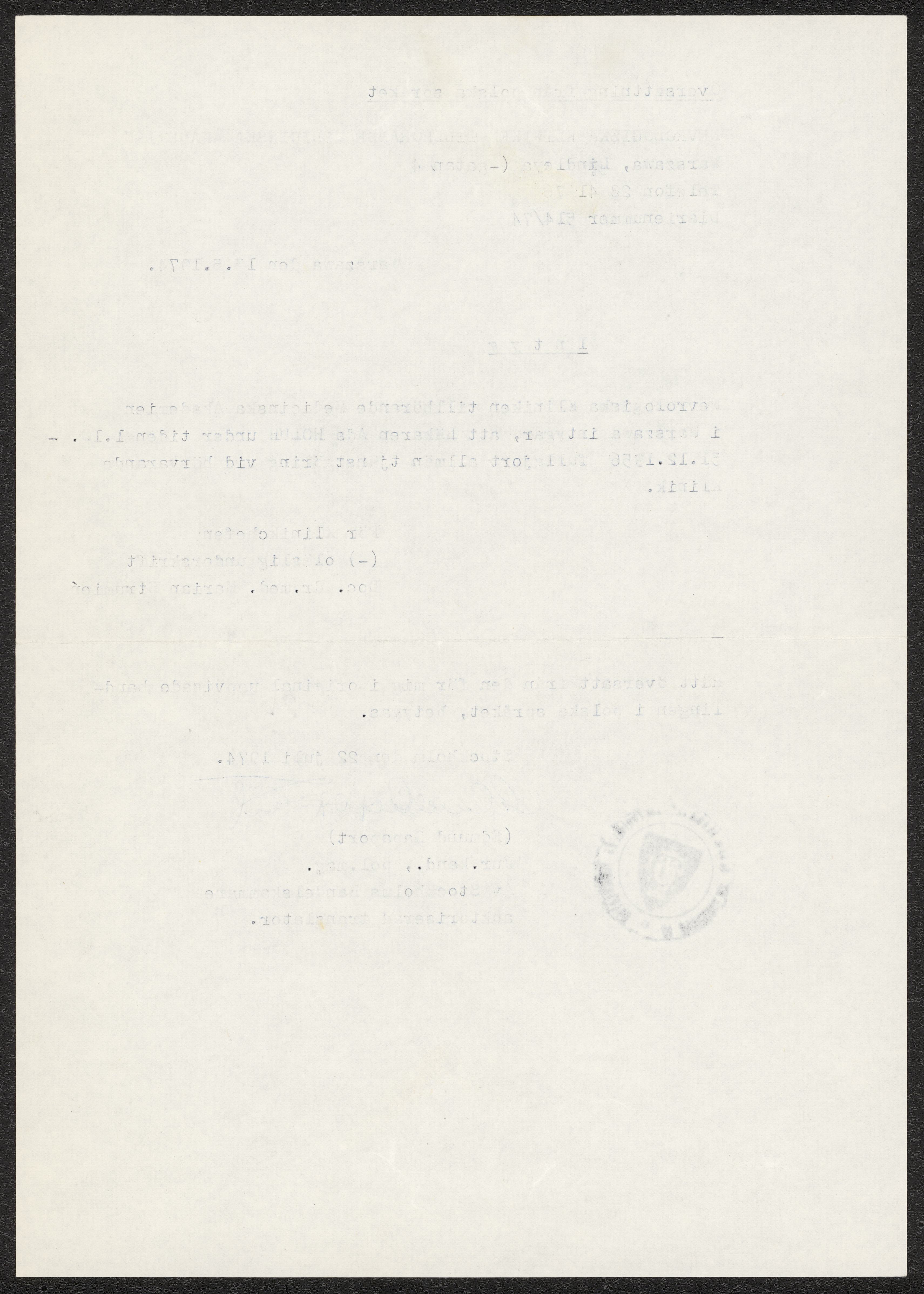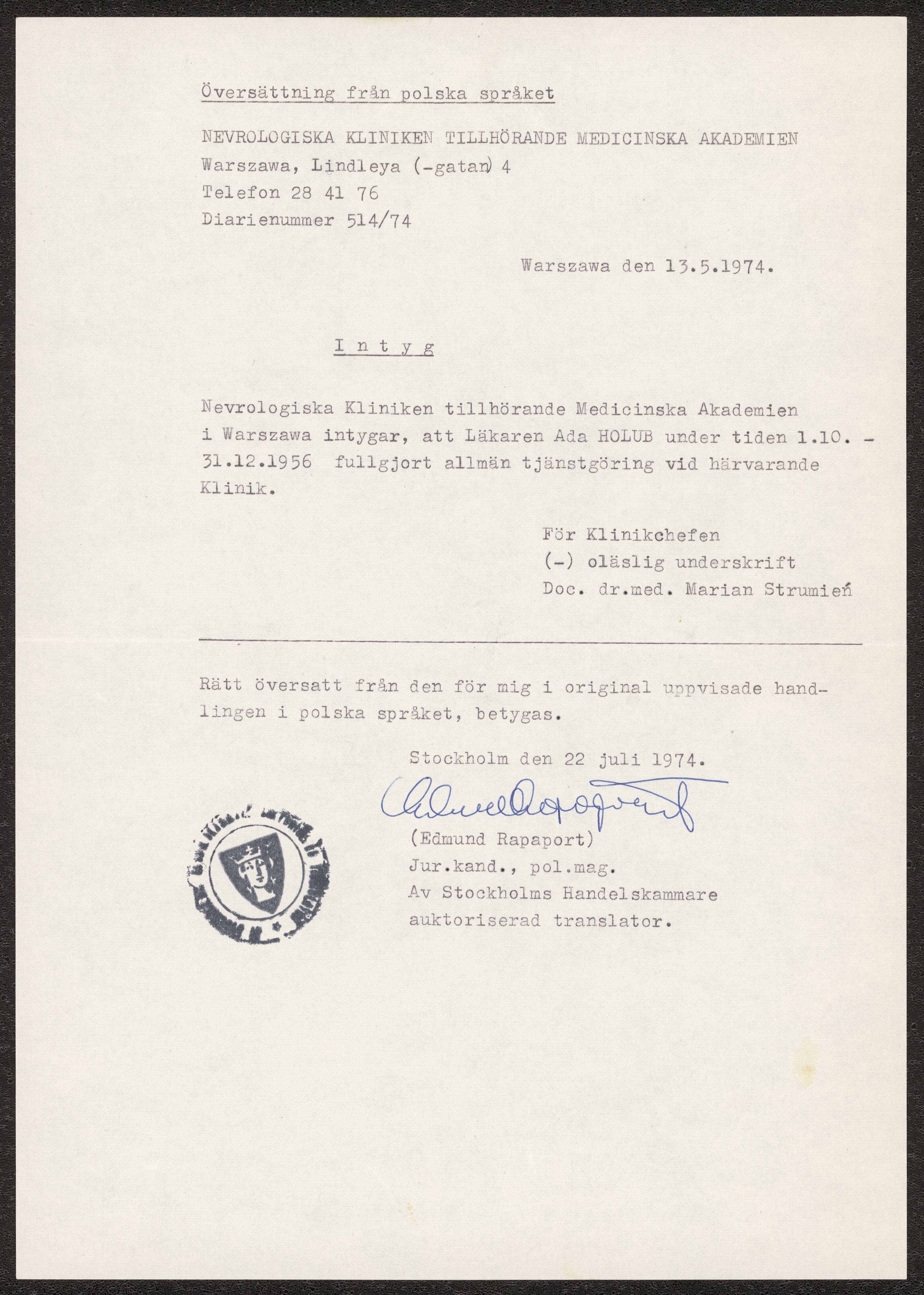 Auktoriserad översättning till svenska av arbetsintyg för Ada Holub. Hon ska enligt intyget ha arbetat vid kliniken från 1 oktober till 31 december 1956.