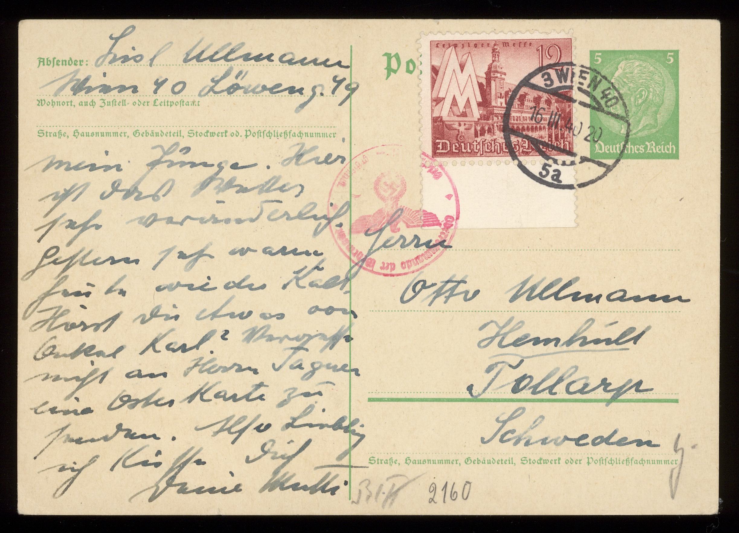 Brev till Otto Ullman från föräldrarna Josef och Elise Ullmann daterat 16 mars 1940 Wien.