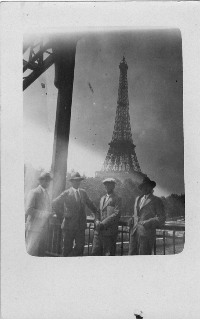 Fotografi av fyra män i Paris. Józef Pastuszuk är andre från höger i bild. Enligt Józefs dotter är fotografiet sannolikt taget år 1931, i samband med övning vid "the French École de Navigation Sous-Marine" i Toulon.