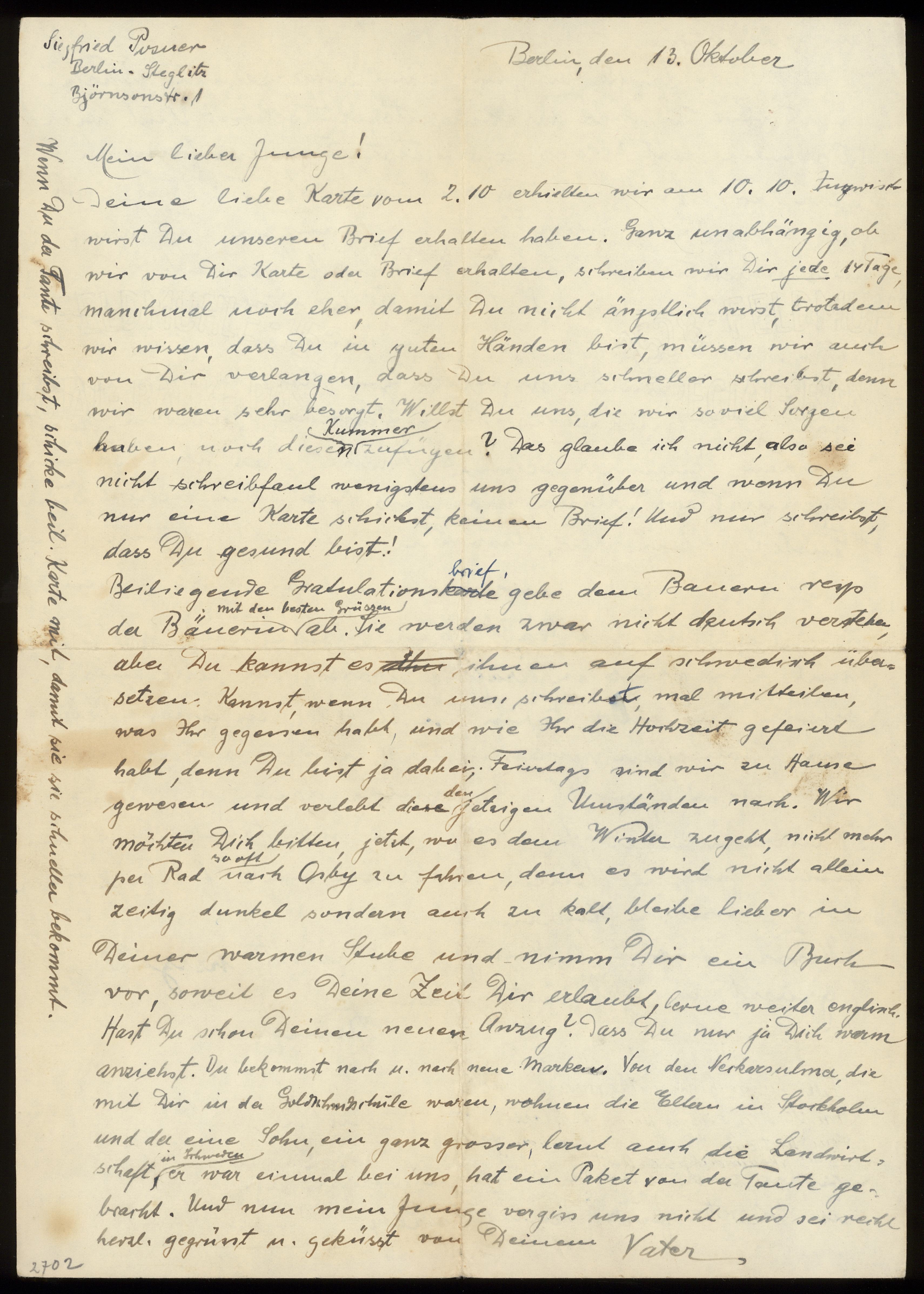 Brev från föräldrarna Anna och Siegfried Posner till sonen Ludwig Posner daterat 13 oktober 1941.