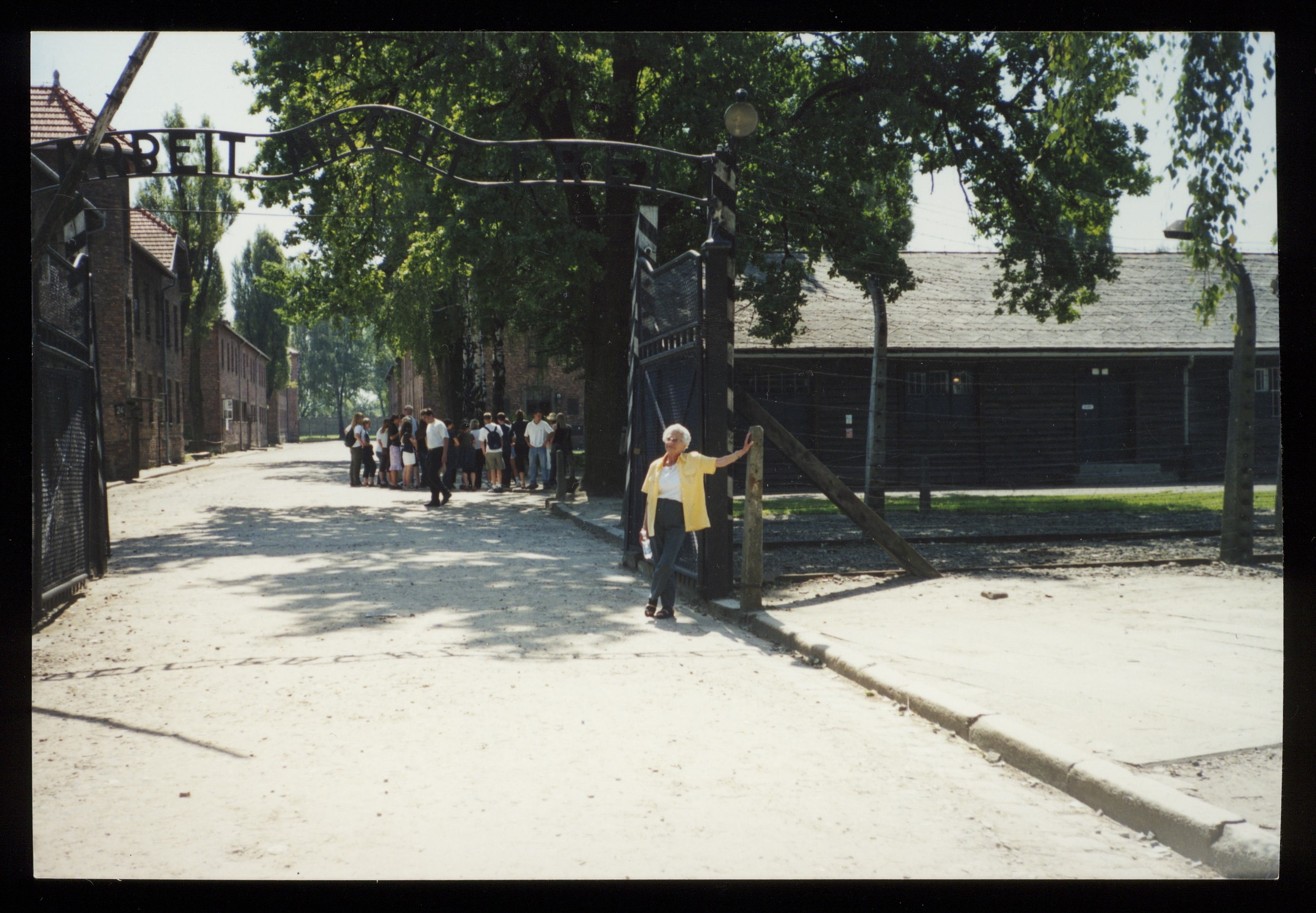 Rosa Gustafsson vid återbesök i Auschwitz, vid ingången till lägret. Hon hade själv under Förintelsen internerats i Szebnie, Auschwitz och Ravensbrück. Under hela sitt liv berättade och föreläste hon om sina upplevelser. Under sitt liv återvände hon till Auschwitz fyra gånger, här i juni år 2000. Vid återbesöket filmades hennes berättelser av i Auschwitz av The State Museum Auschwitz-Birkenau in Oświęcim den 20 juni 2000. Filmen finns bevarad i deras arkiv och består av en intervju med Rosa Gustavsson utförd av Bożena Kramarczyk.
