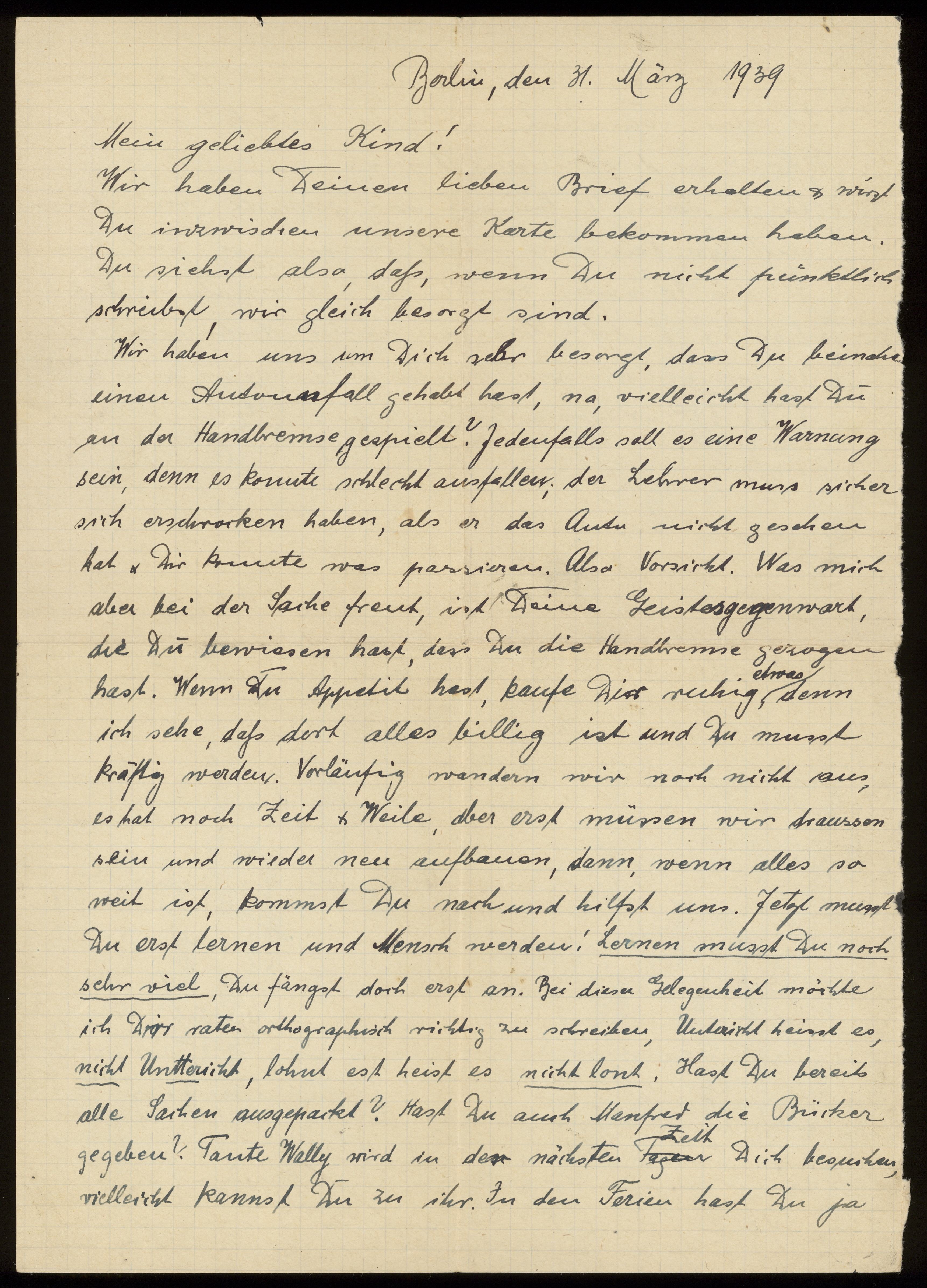 Brev från föräldrarna Anna och Siegfried Posner till sonen Ludwig Posner daterat 31 mars 1939.