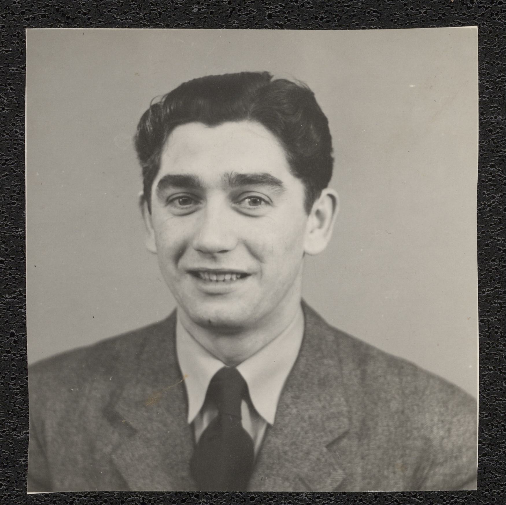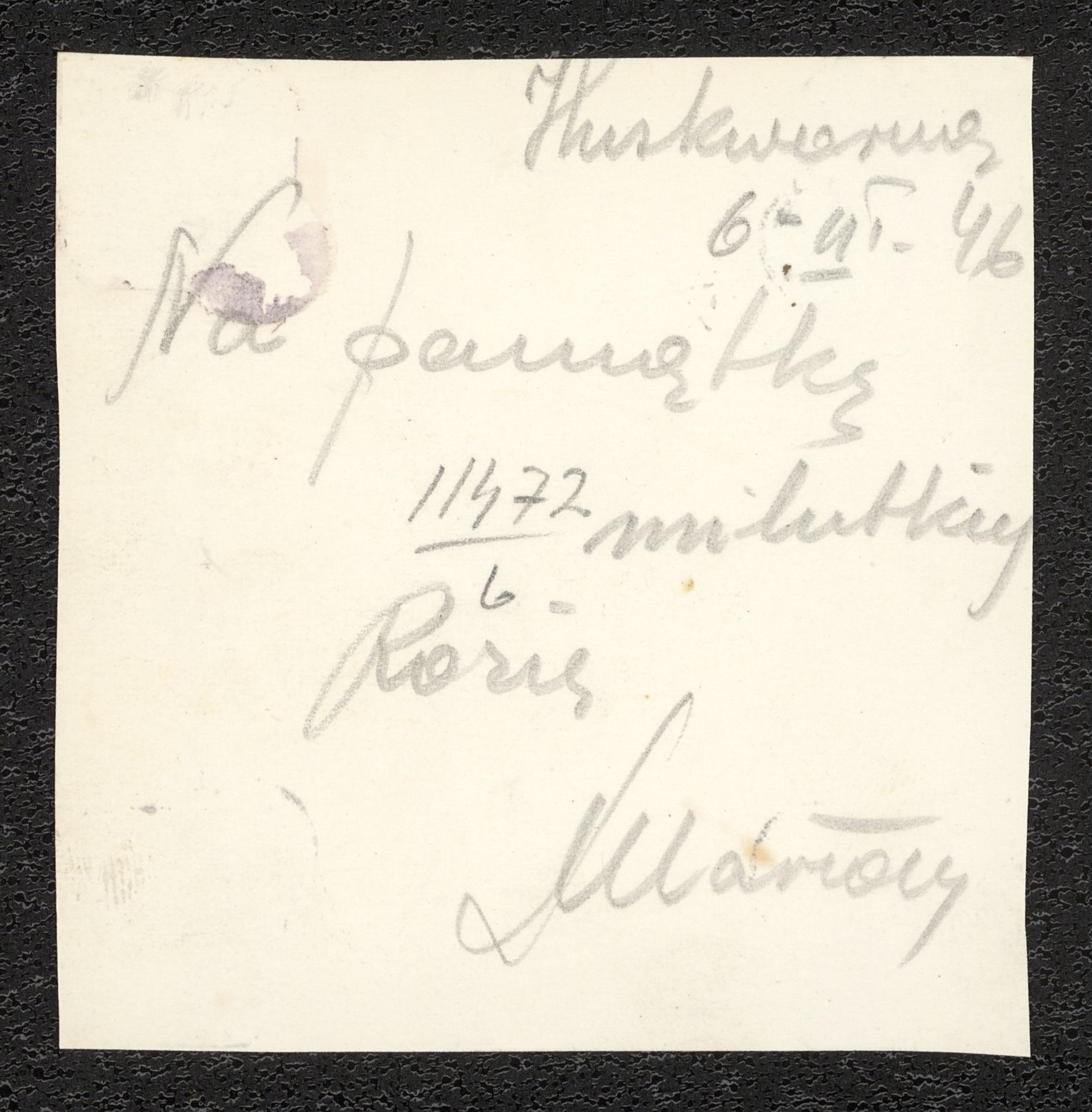 Porträttfotografi av okänd man. På baksidan text på polska: Huskvarna 6-*-46. Na ??? ?? Rozia. ??.