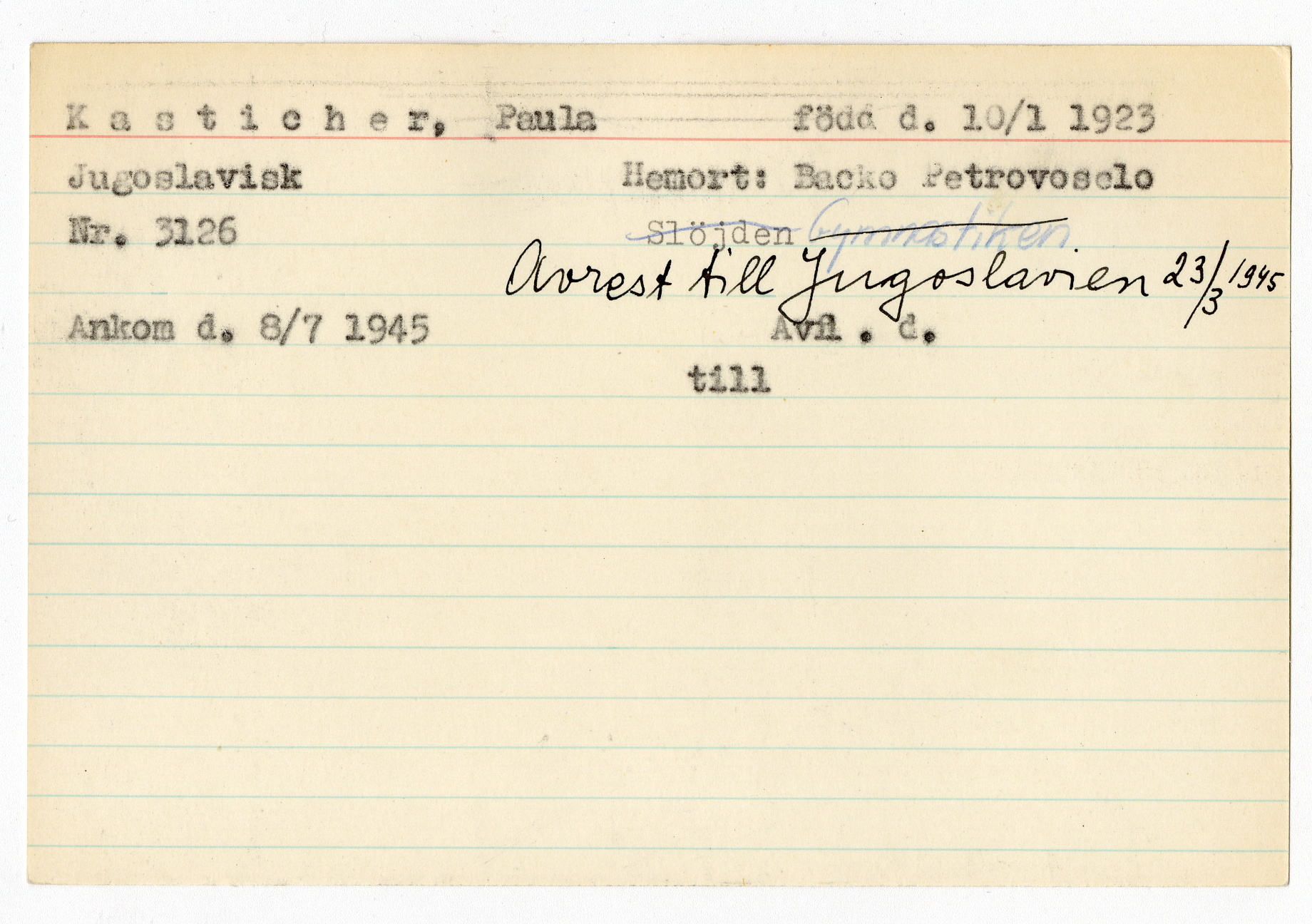 Ett skrivkort med patientuppgifter gällande Paula Kasticher.