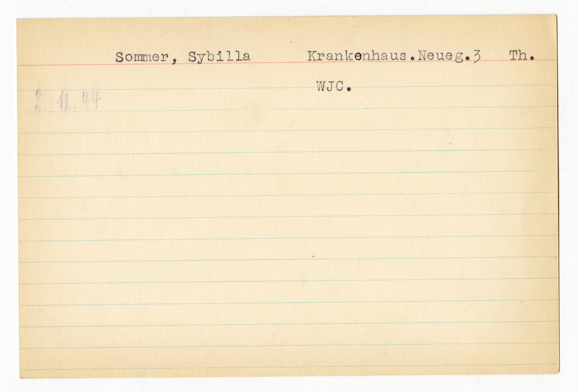 Ett skrivkort med patientuppgifter gällande Iren Rubin. På baksidan uppgifter om matpaket till Sybilla Sommer i Theresienstadt.
