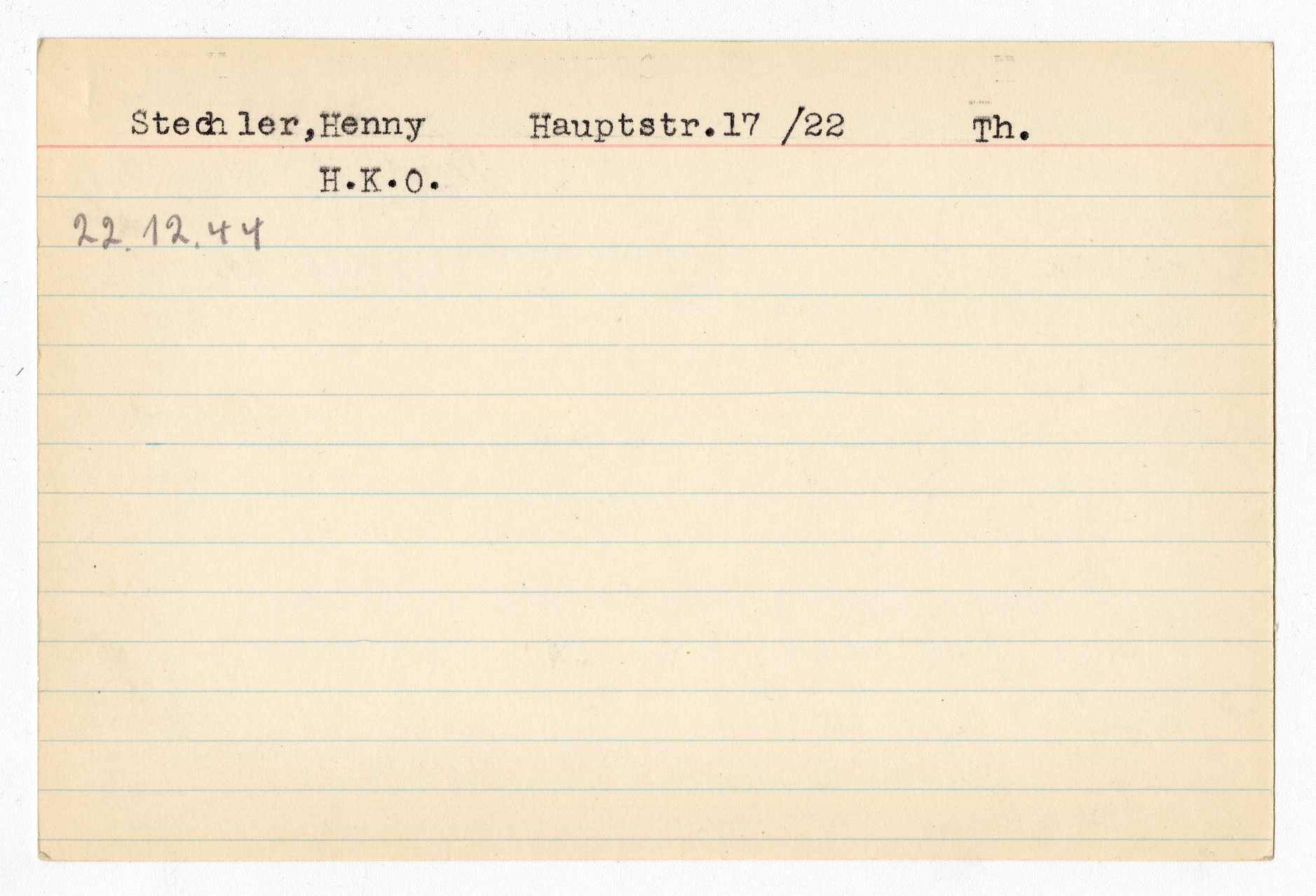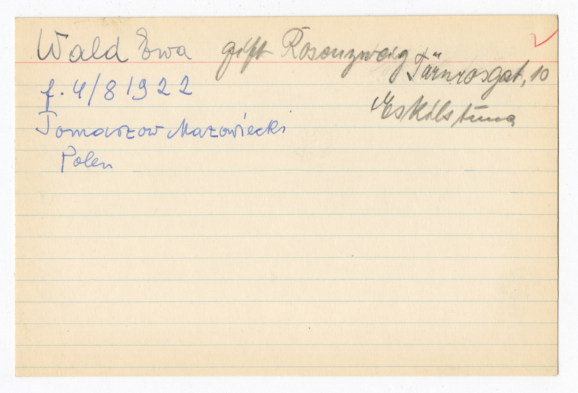 Ett skrivkort med patientuppgifter gällande Ewa Wald. På baksidan uppgifter om matpaket till Henny Stechler i Theresienstadt.