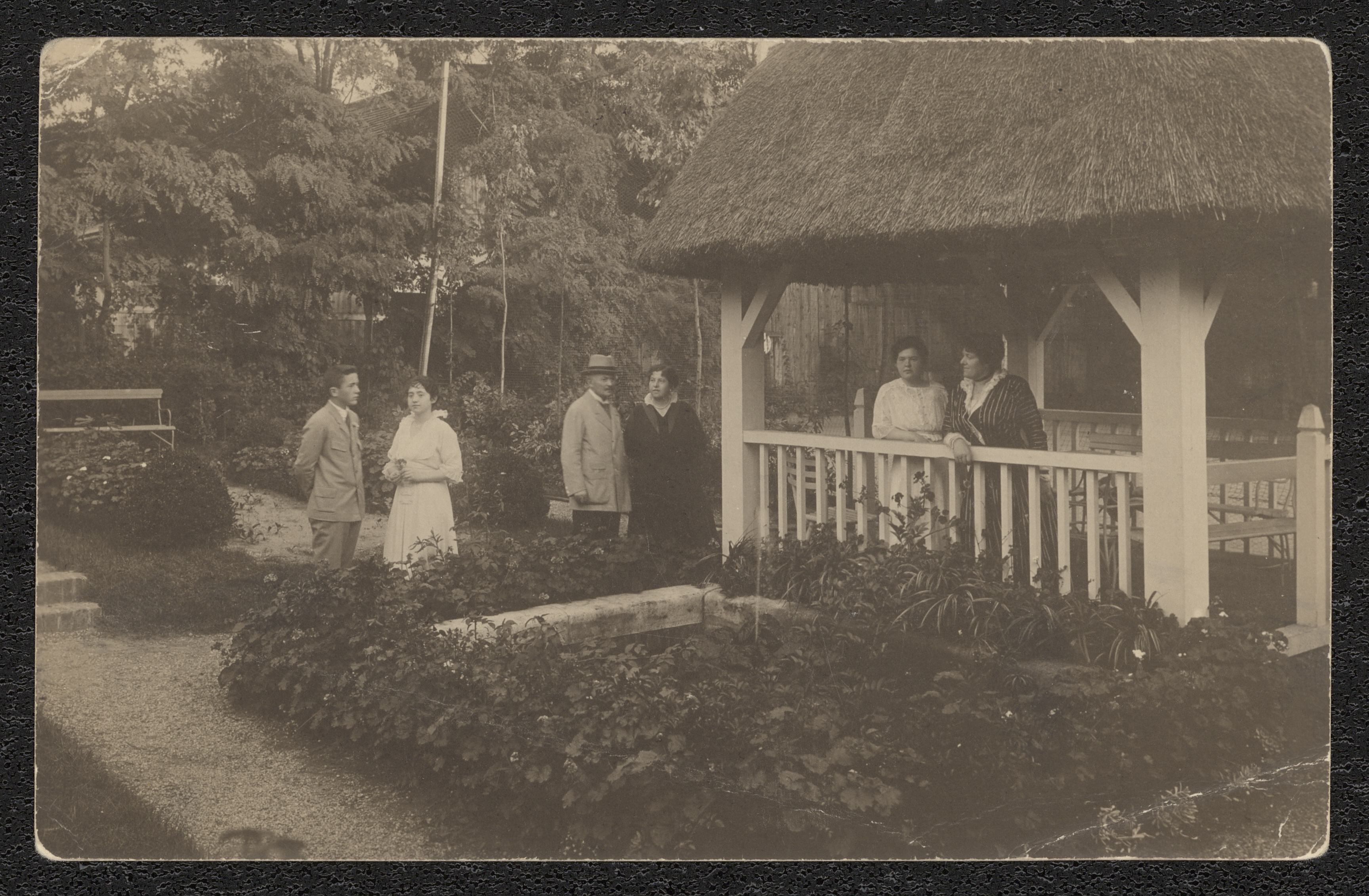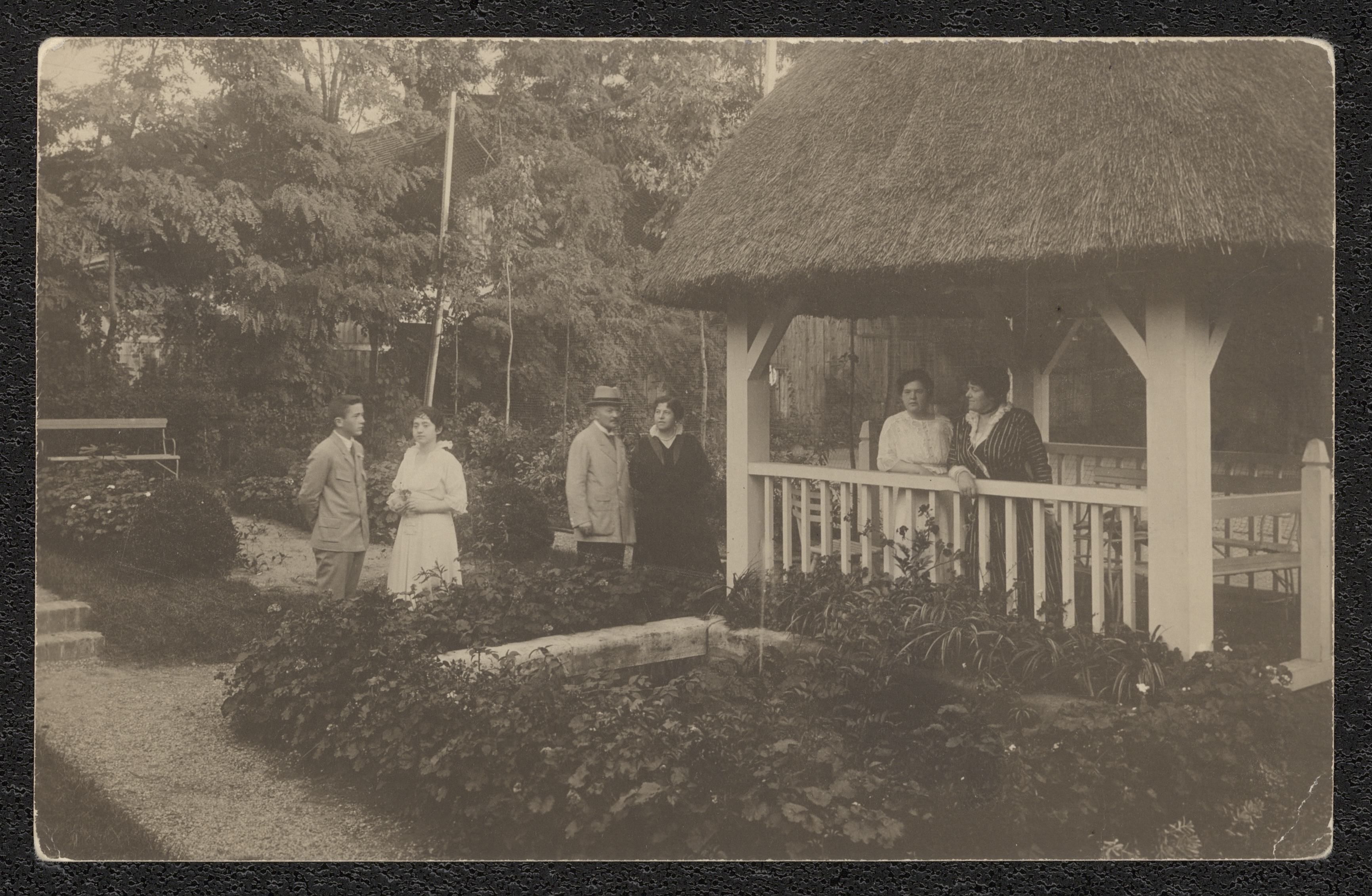 Gruppfotografi föreställande Georg Witts familj i trädgården i Újpest innan kriget.