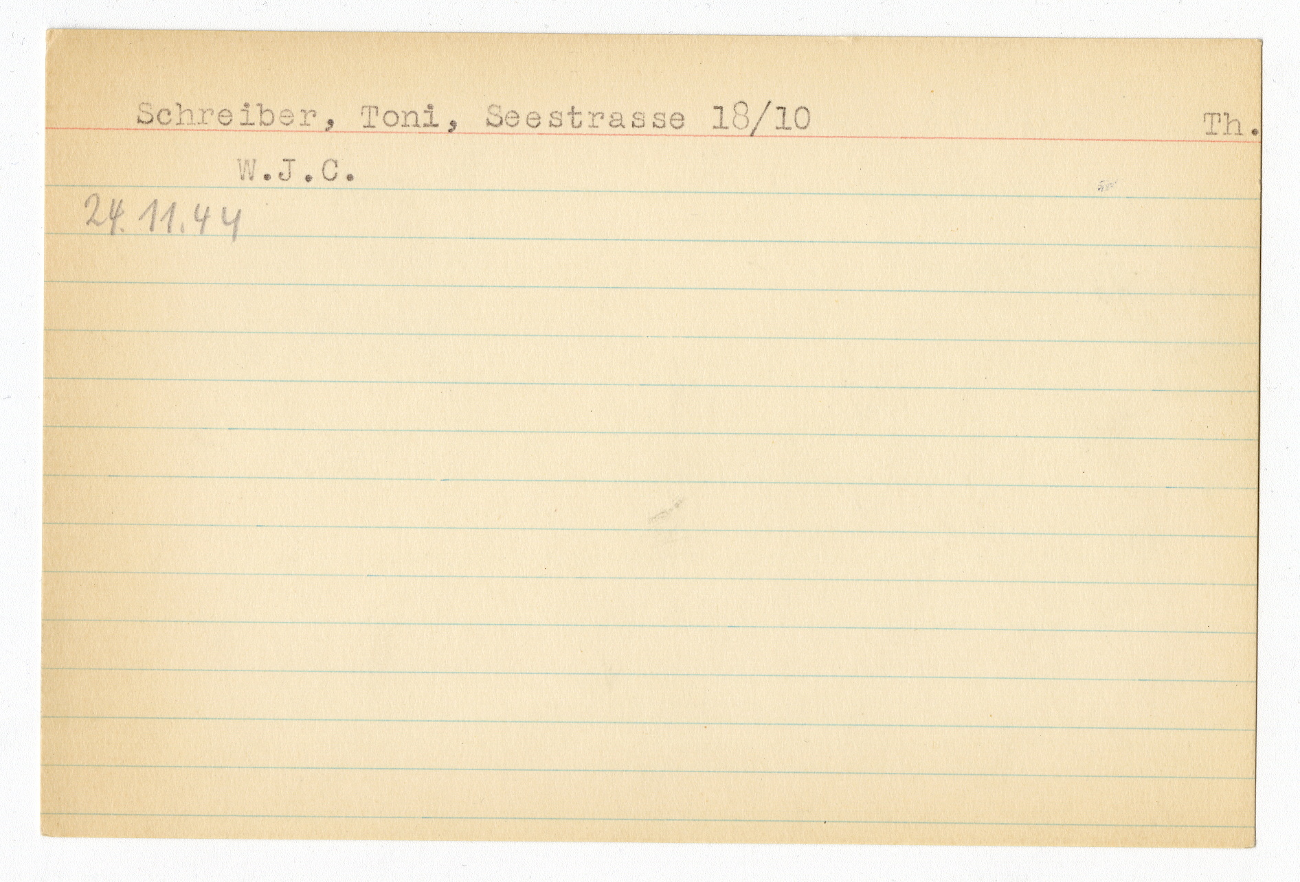 Ett skrivkort med patientuppgifter gällande Rozi Leovits. På baksidan uppgifter om matpaket till Toni Schreiber i Theresienstadt.