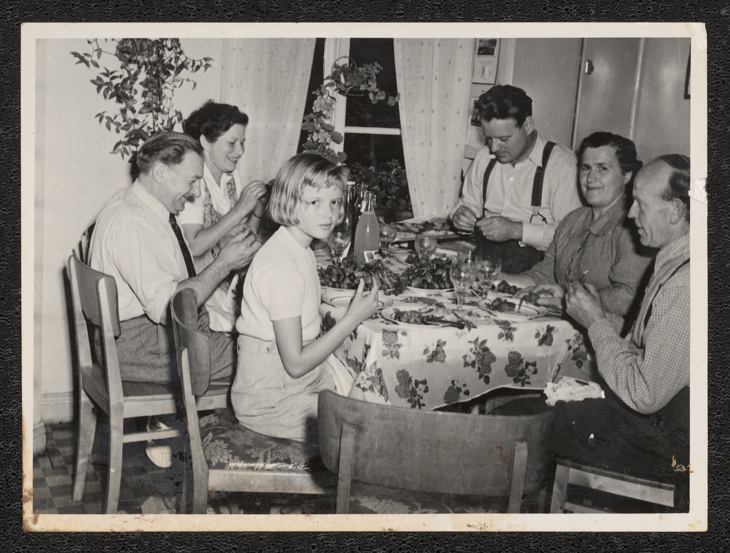 Rosa Gustafsson och maken Gunnar på kräftskiva hos Rundqvists. Från höger: Vännen Erland, Rosa Gustafsson, Inger (dotter till Valle och Judith) Gunnar Gustafsson, Judith och Valle Rundqvist. Stolen närmast kameran är tom. På bordet finns kräftor och dryck.