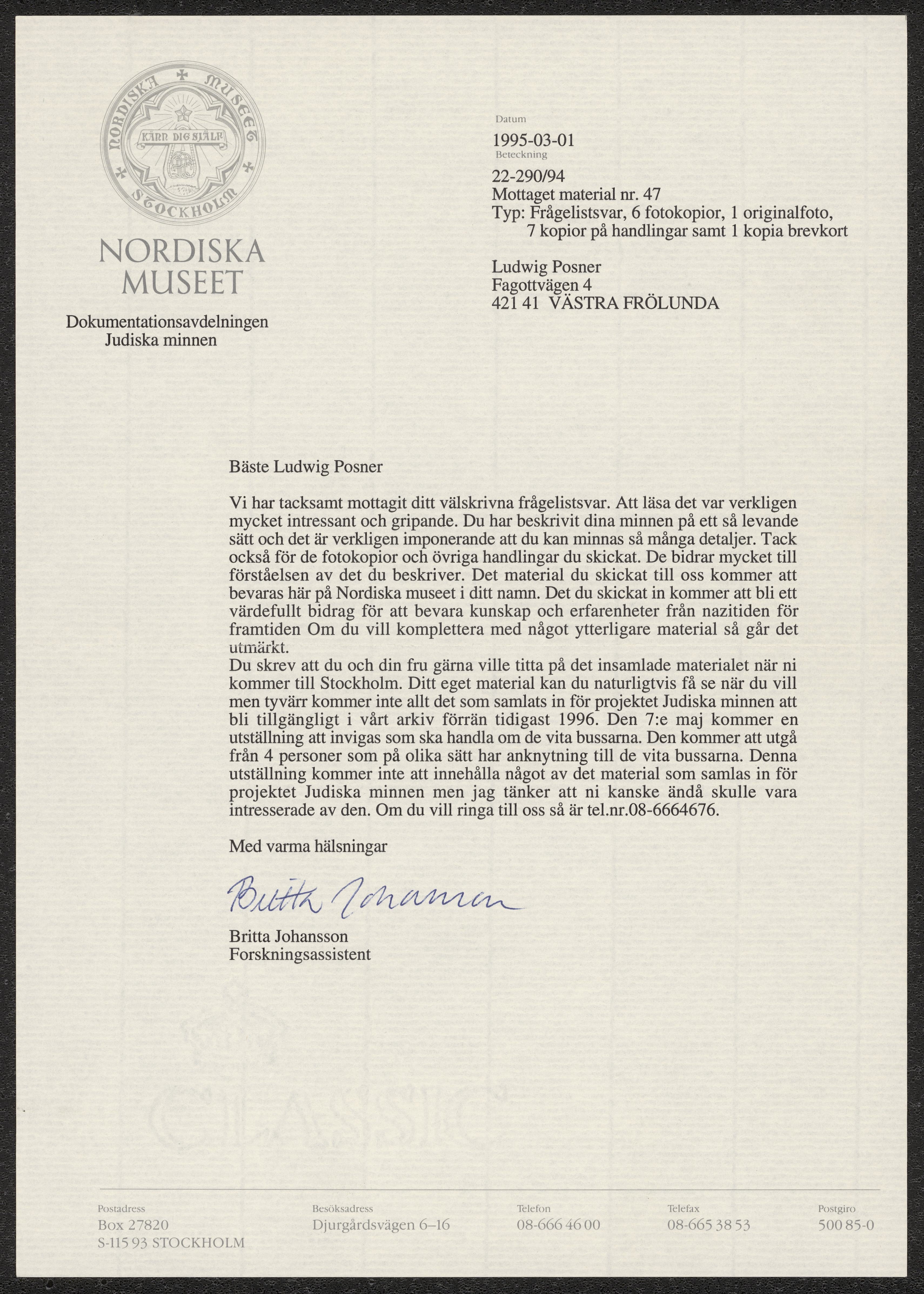 Brev till Ludwig Posner från Nordiska museet