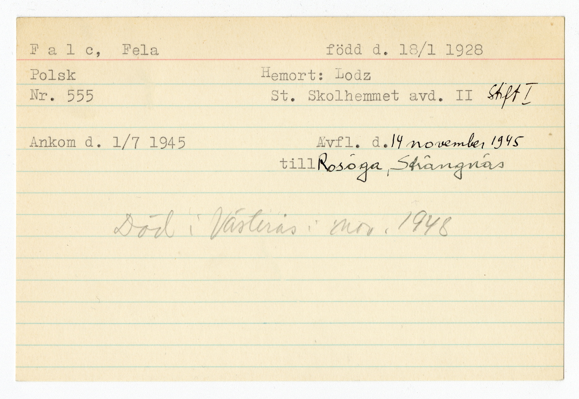 Ett skrivkort med patientuppgifter gällande Fela Falc.