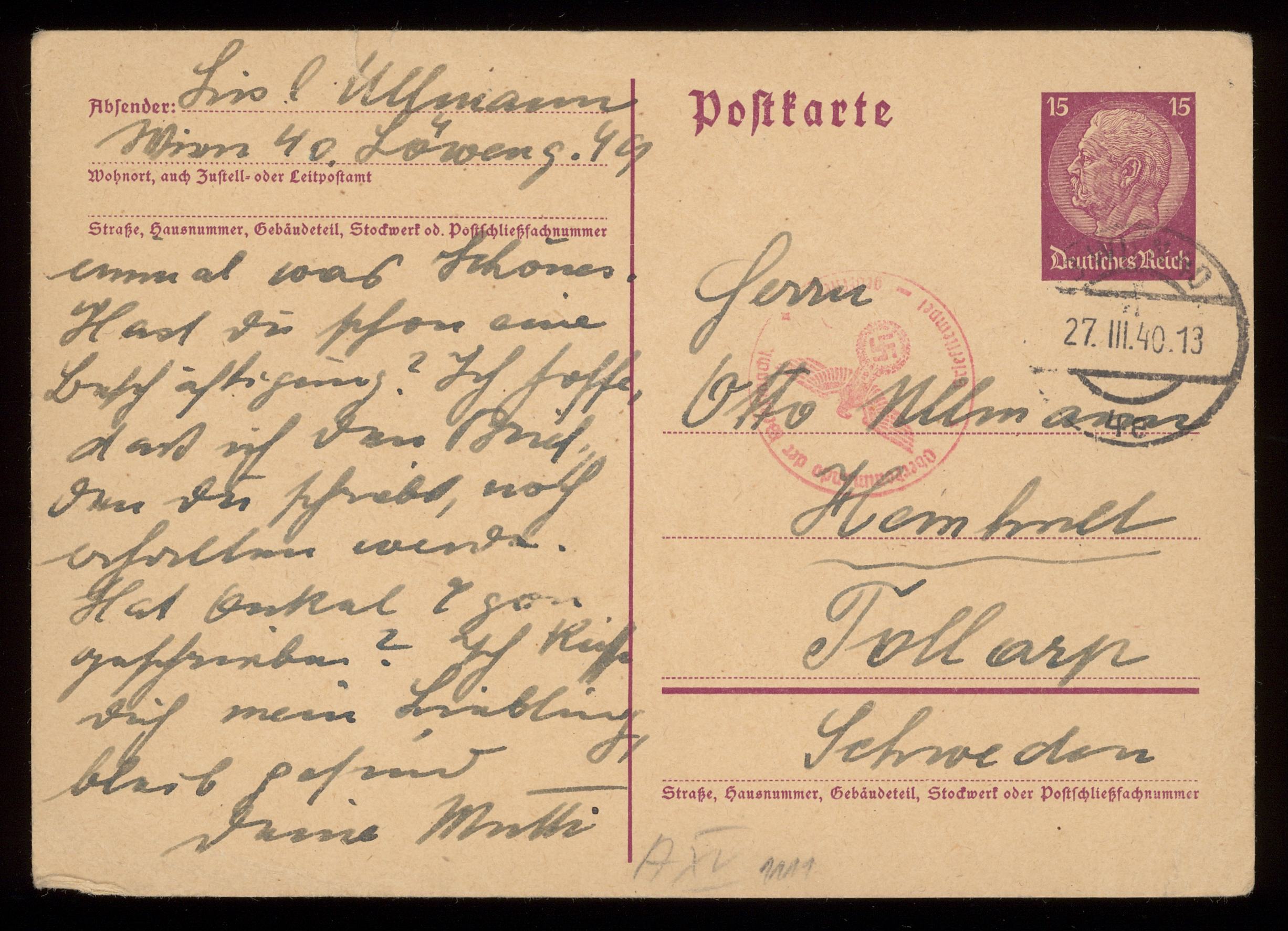 Brev till Otto Ullman från föräldrarna Josef och Elise Ullmann daterat 27 mars 1940 Wien.