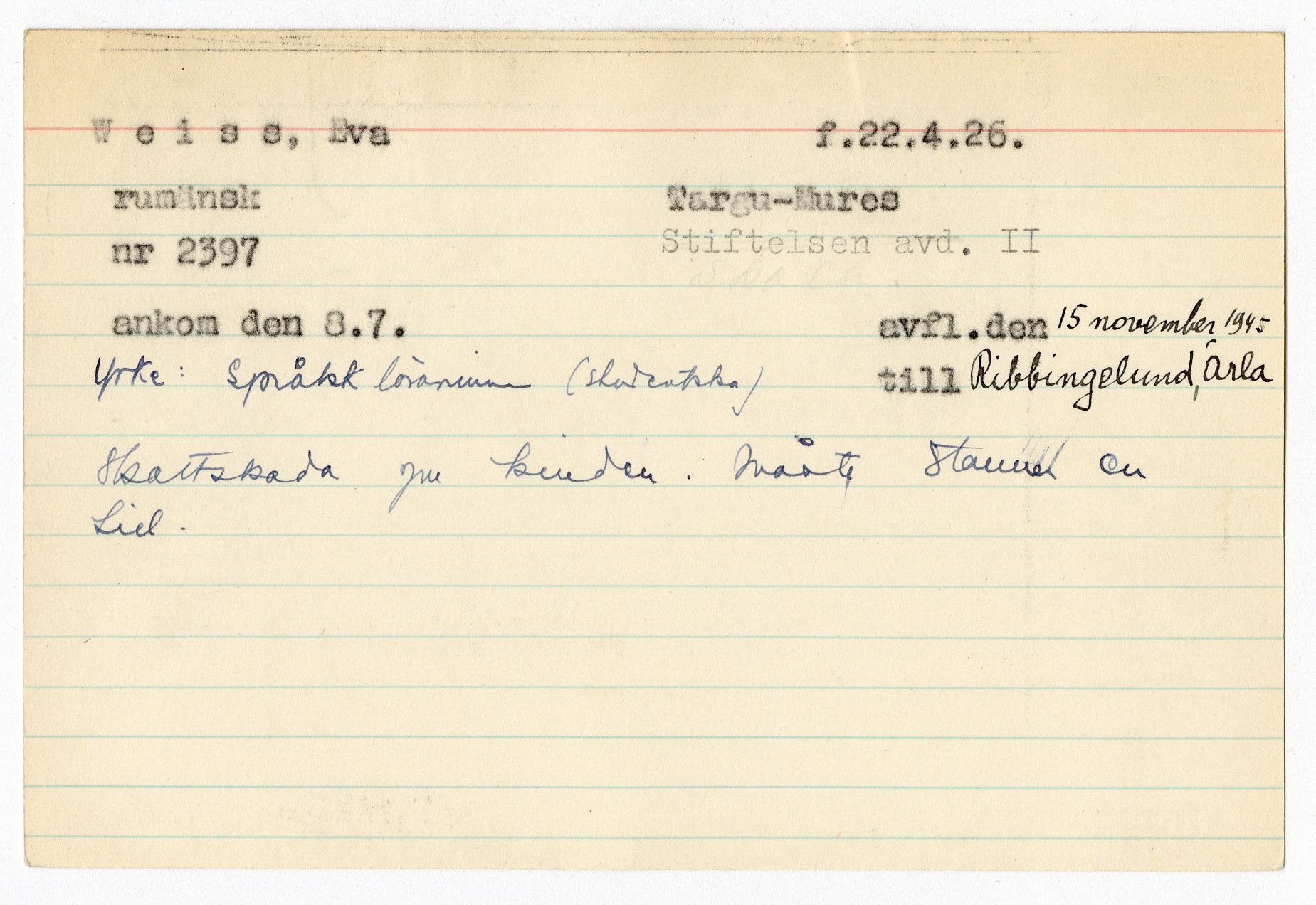 Ett skrivkort med patientuppgifter gällande Eva Weiss.