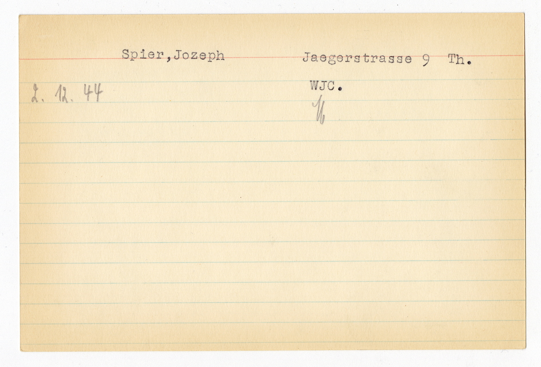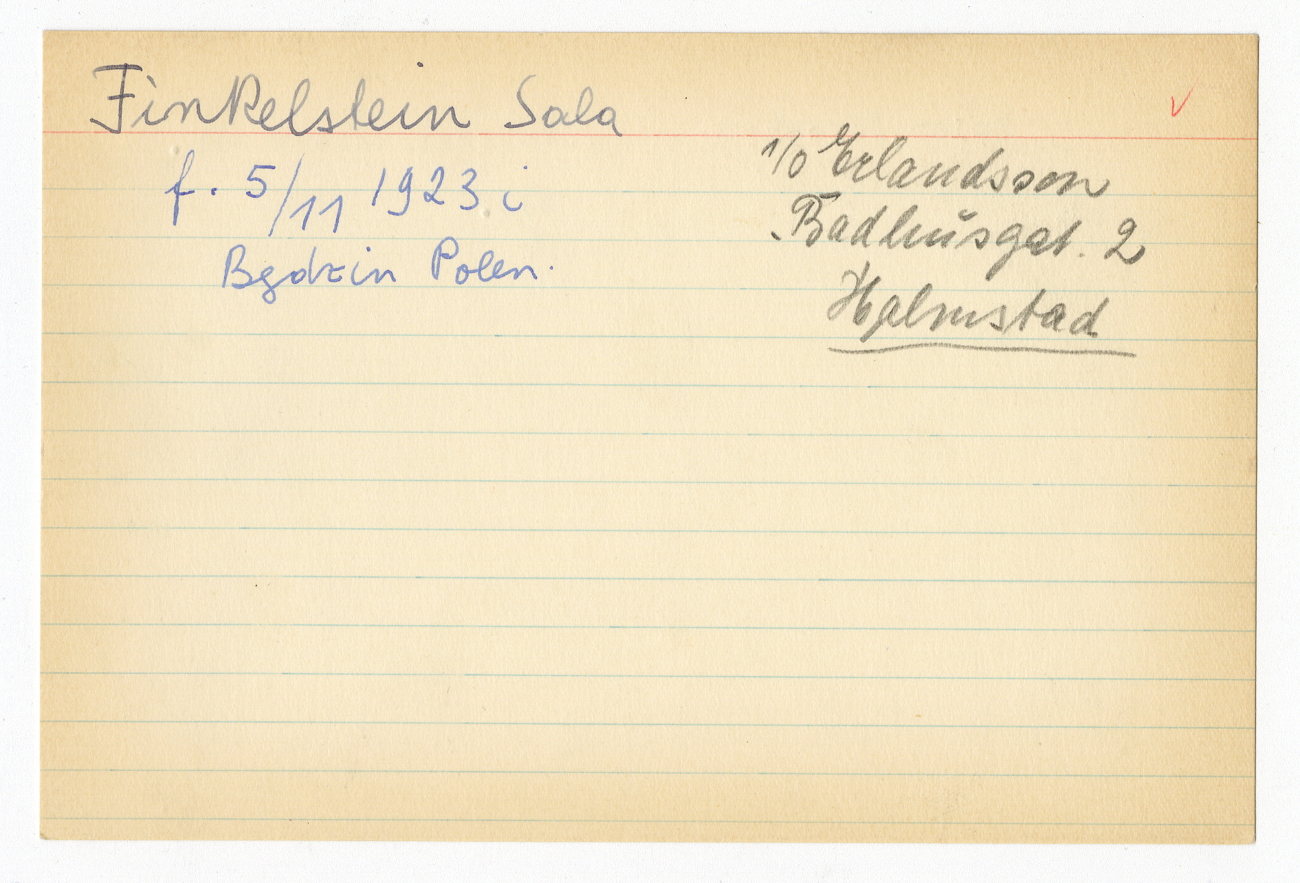 Ett skrivkort med patientuppgifter gällande Sola Finkelstein. På baksidan uppgifter om matpaket till Jozeph Spier i Theresienstadt.