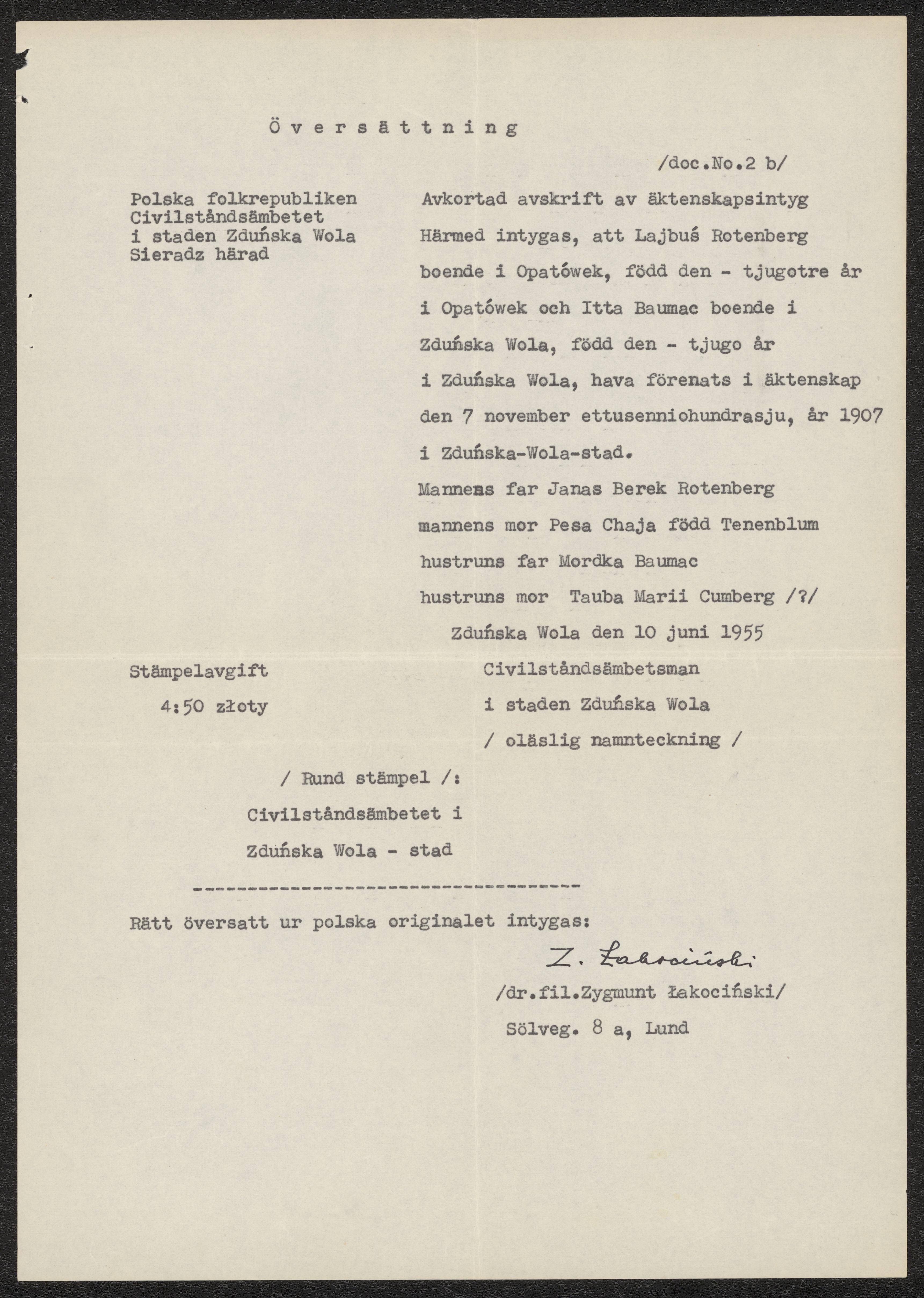 Översättning av äktenskapsbevis 1955-06-10