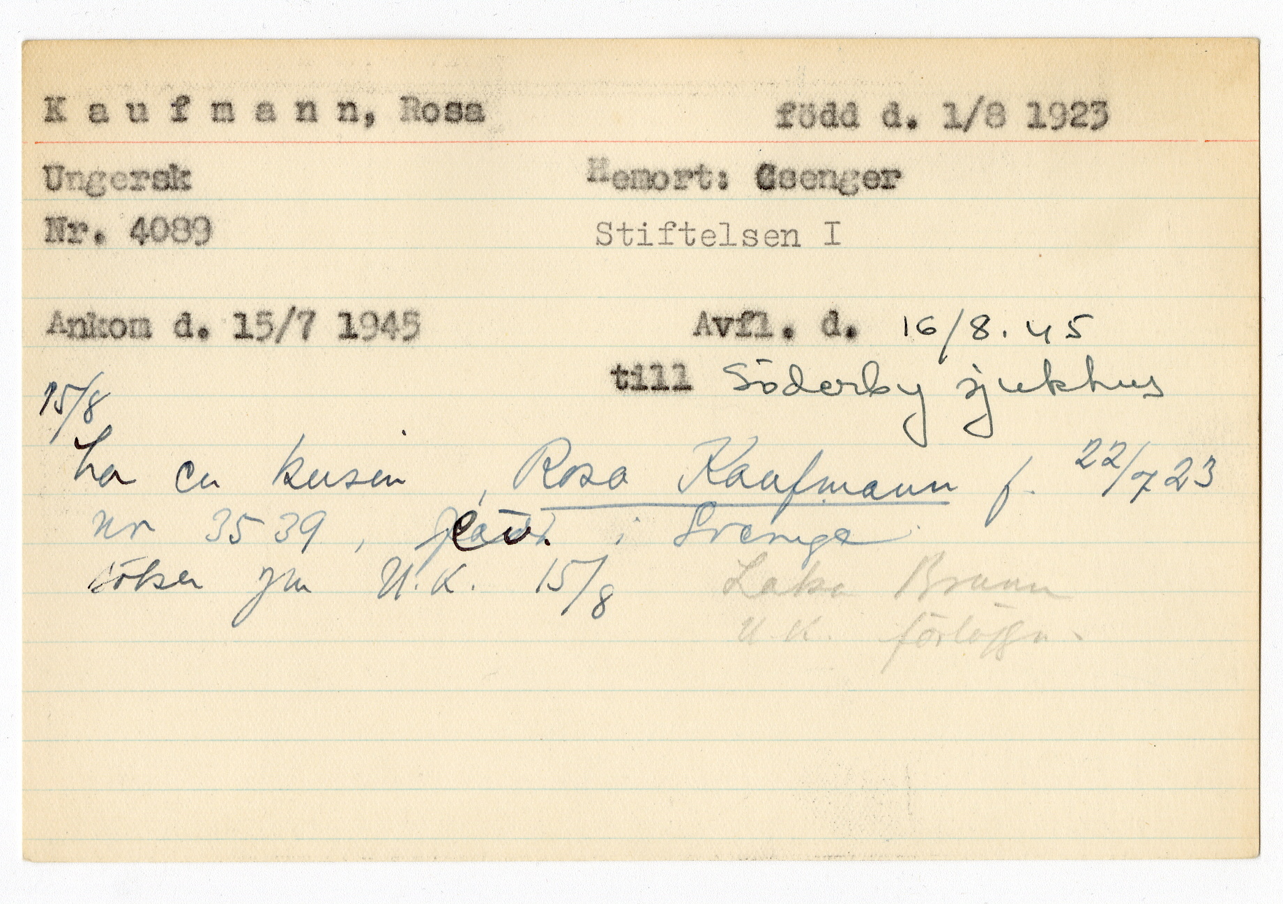 Ett skrivkort med patientuppgifter gällande Rosa Kaufmann.