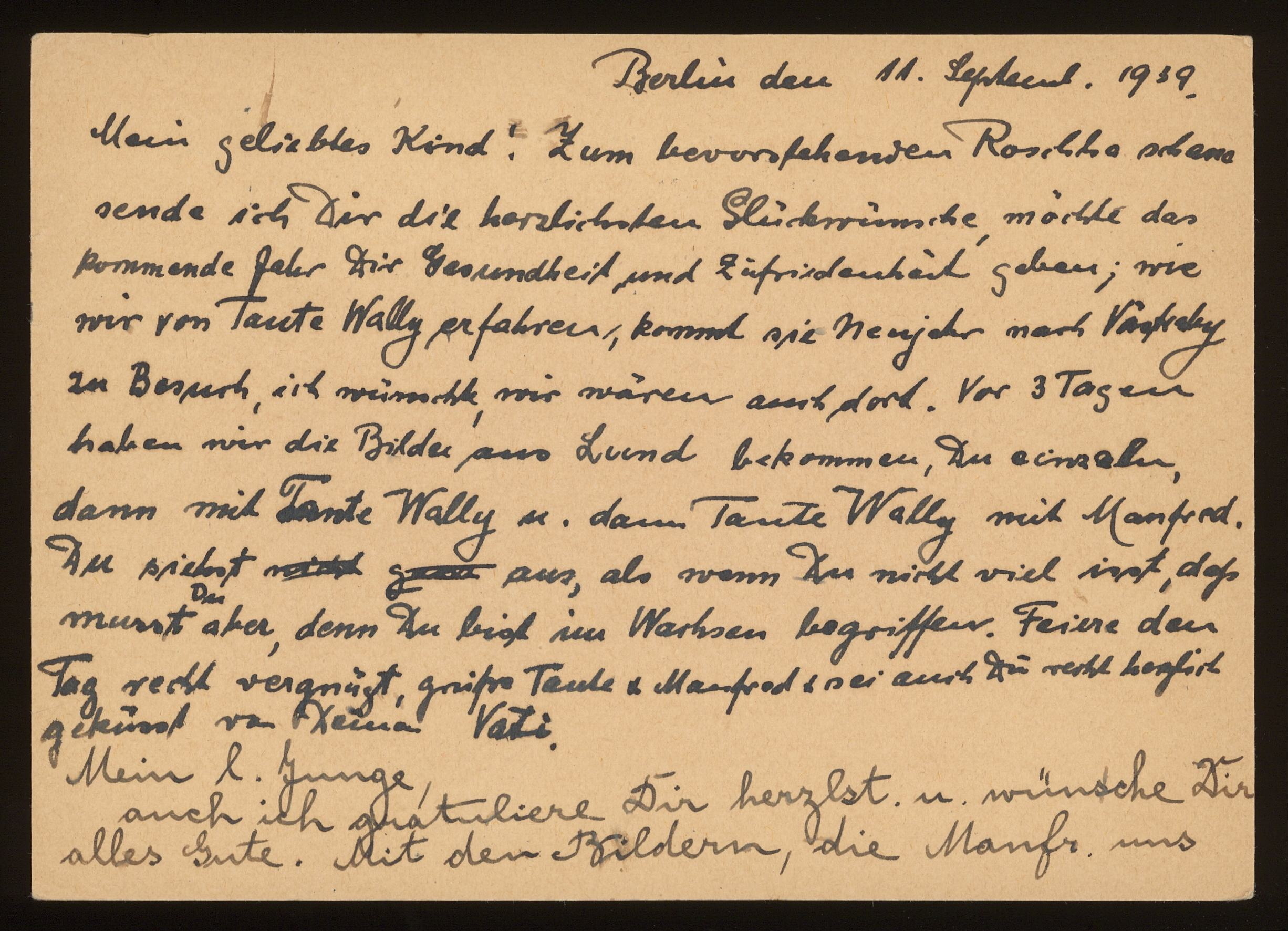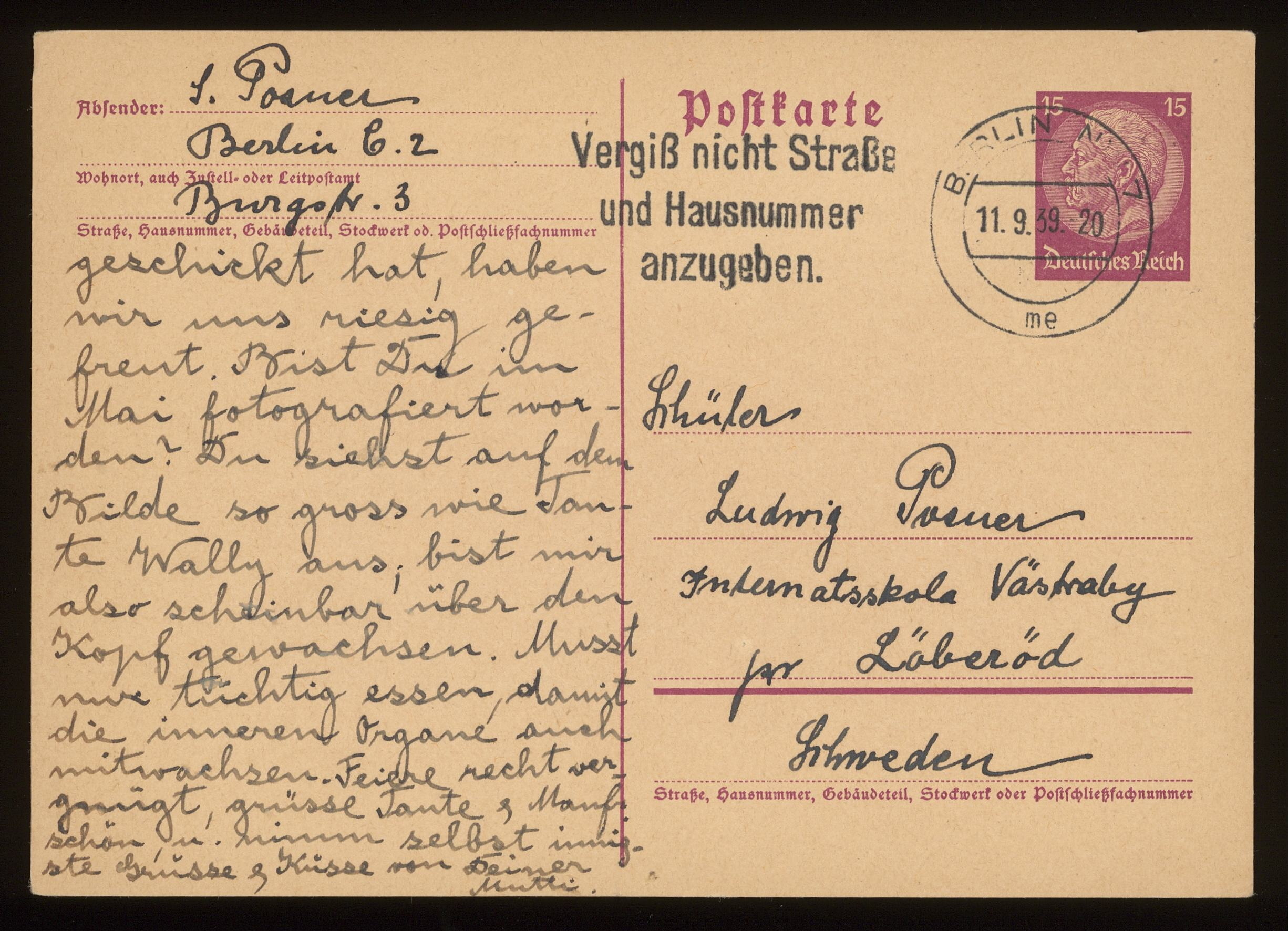 Brevkort från föräldrarna Anna och Siegfried Posner till sonen Ludwig Posner daterat 11 september 1939.