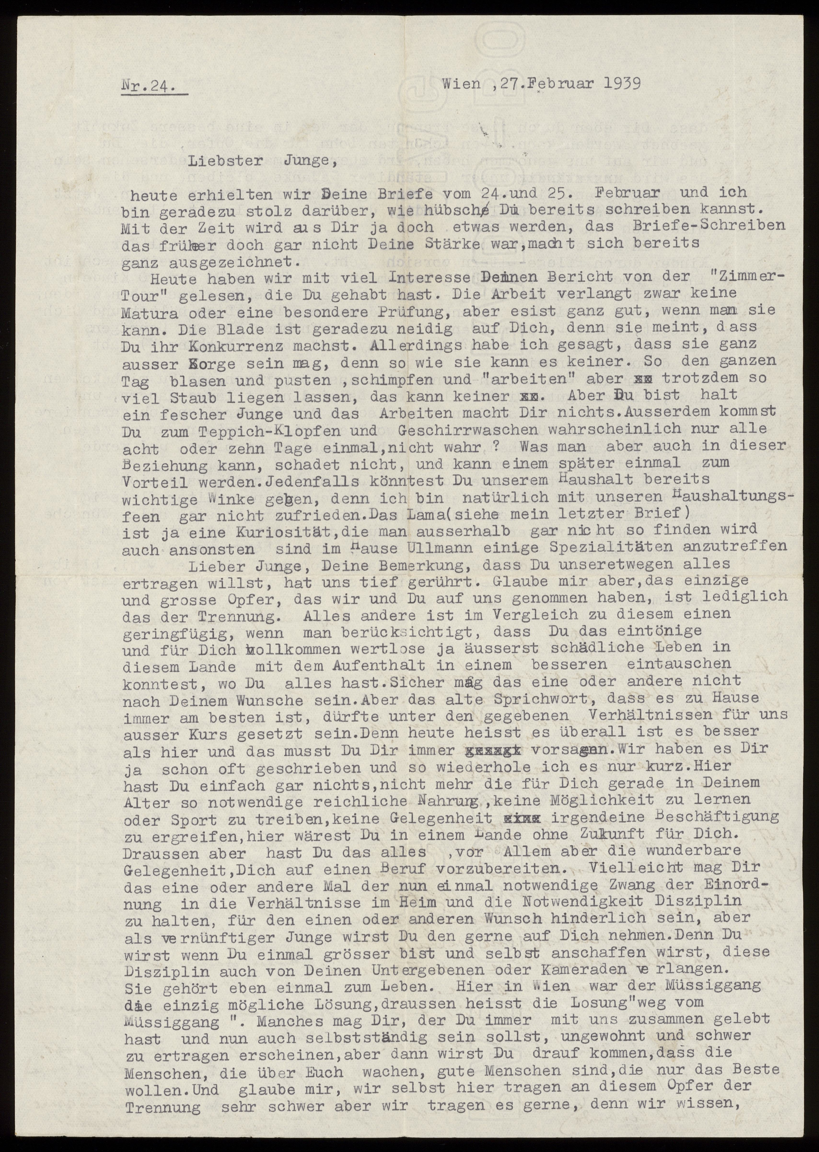 Maskinskrivet brev till Otto Ullmann från föräldrarna Josef och Elise Ullmann, moster Grete Kollmann, moster Minna "Nuny" Kollmann och morbror Paul Kollmann daterat 27 februari 1939 Wien.