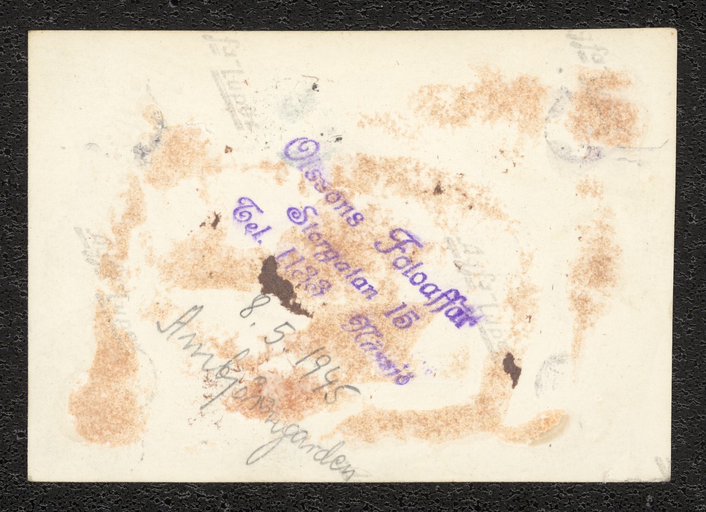 Gruppfotografi från Ambjörnsgården i Nässjö, augusti 1945. Rosa Gustafsson tredje från vänster, till höger om henne står väninnan Hanka Cukier. Längst till vänster står Lucy Gankvist (f. Ludwika Flum). Till höger om soldaten i mitten står Ewa. På baksidan finns texten: 8.5. 1945 Ambjörnsgården.