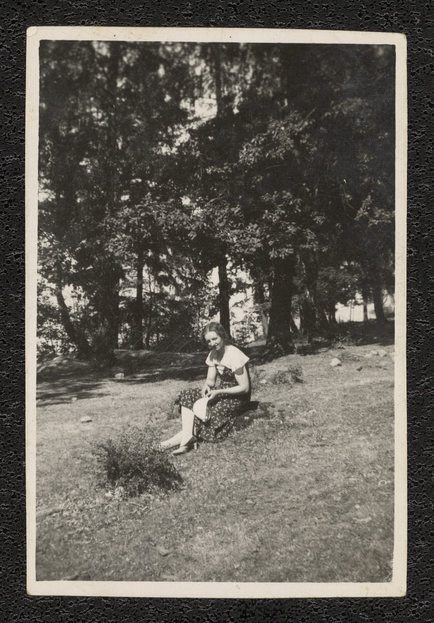 En okänd kvinna sitter på en sten på en gräsmatta. Bildens ursprung är okänt, men har tillhört Rosa Gustafsson. Möjligen är kvinnan en av dem som kom samtidigt med Rosa till Sverige 1945.