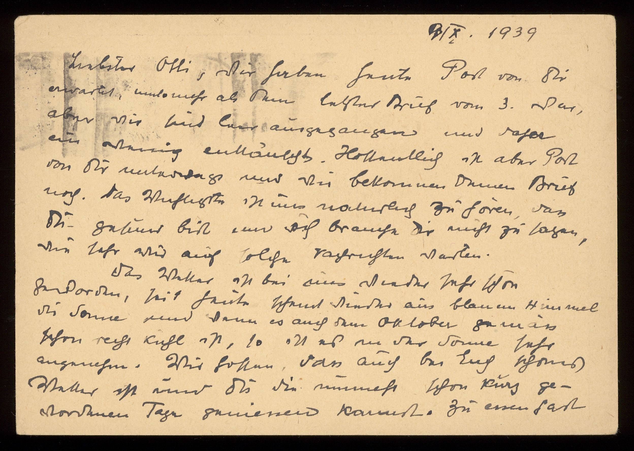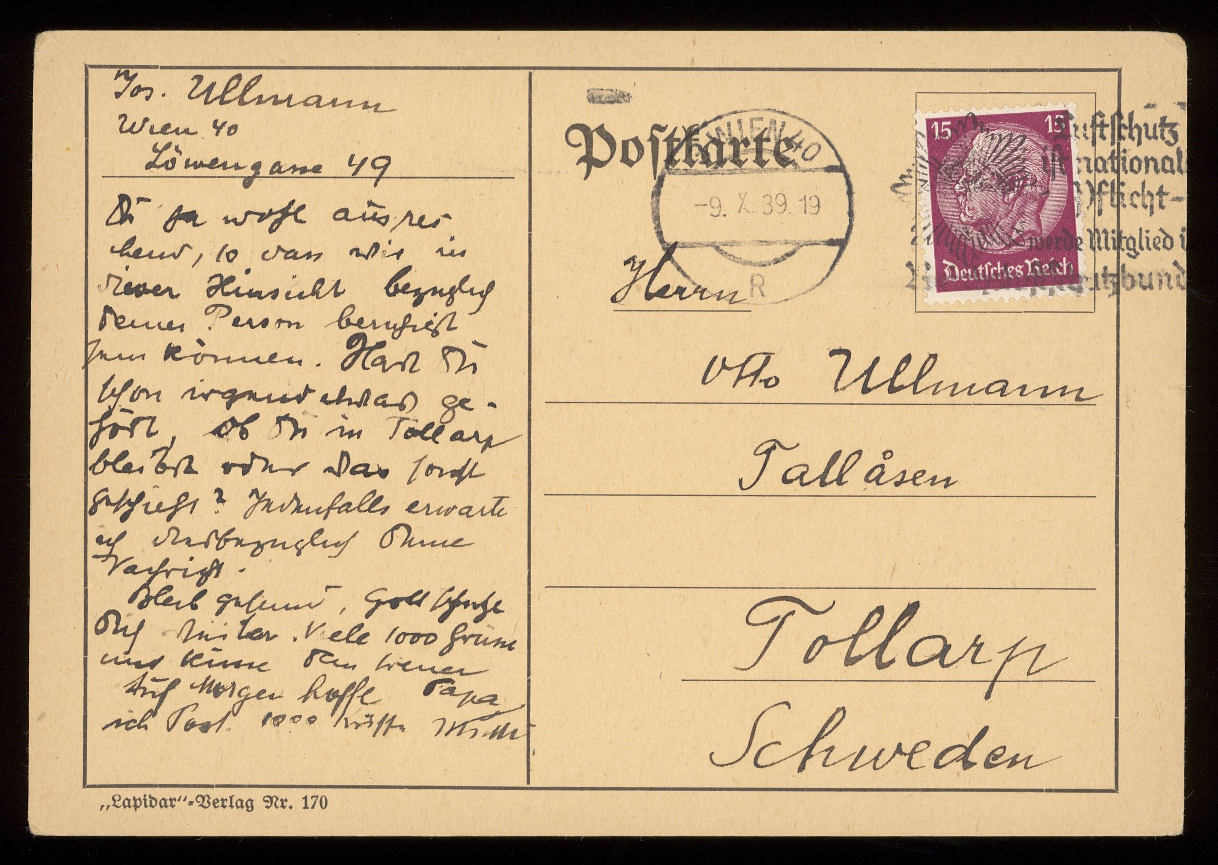 Brev till Otto Ullman från föräldrarna Josef och Elise Ullmann daterat 9 oktober 1939 Wien.