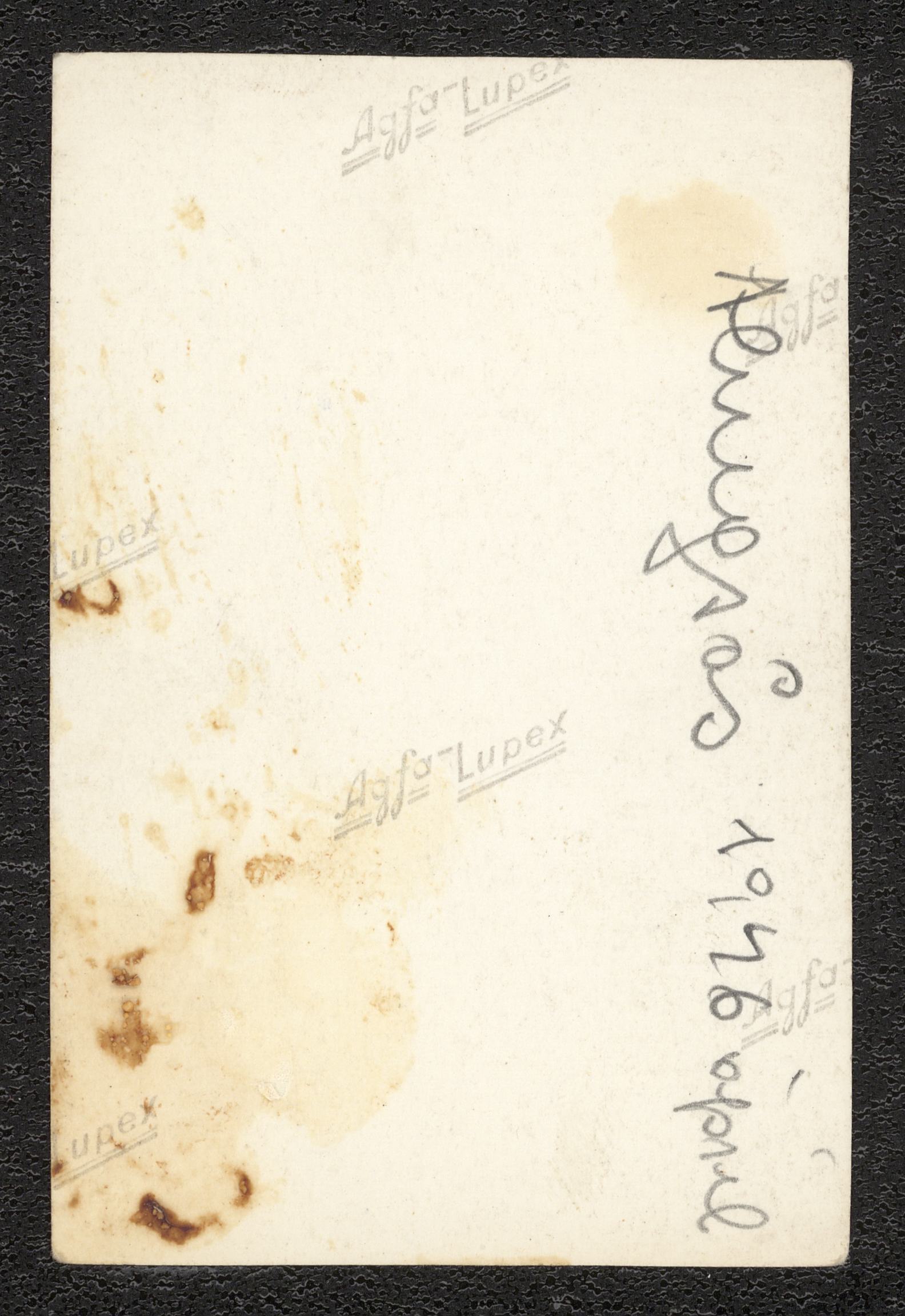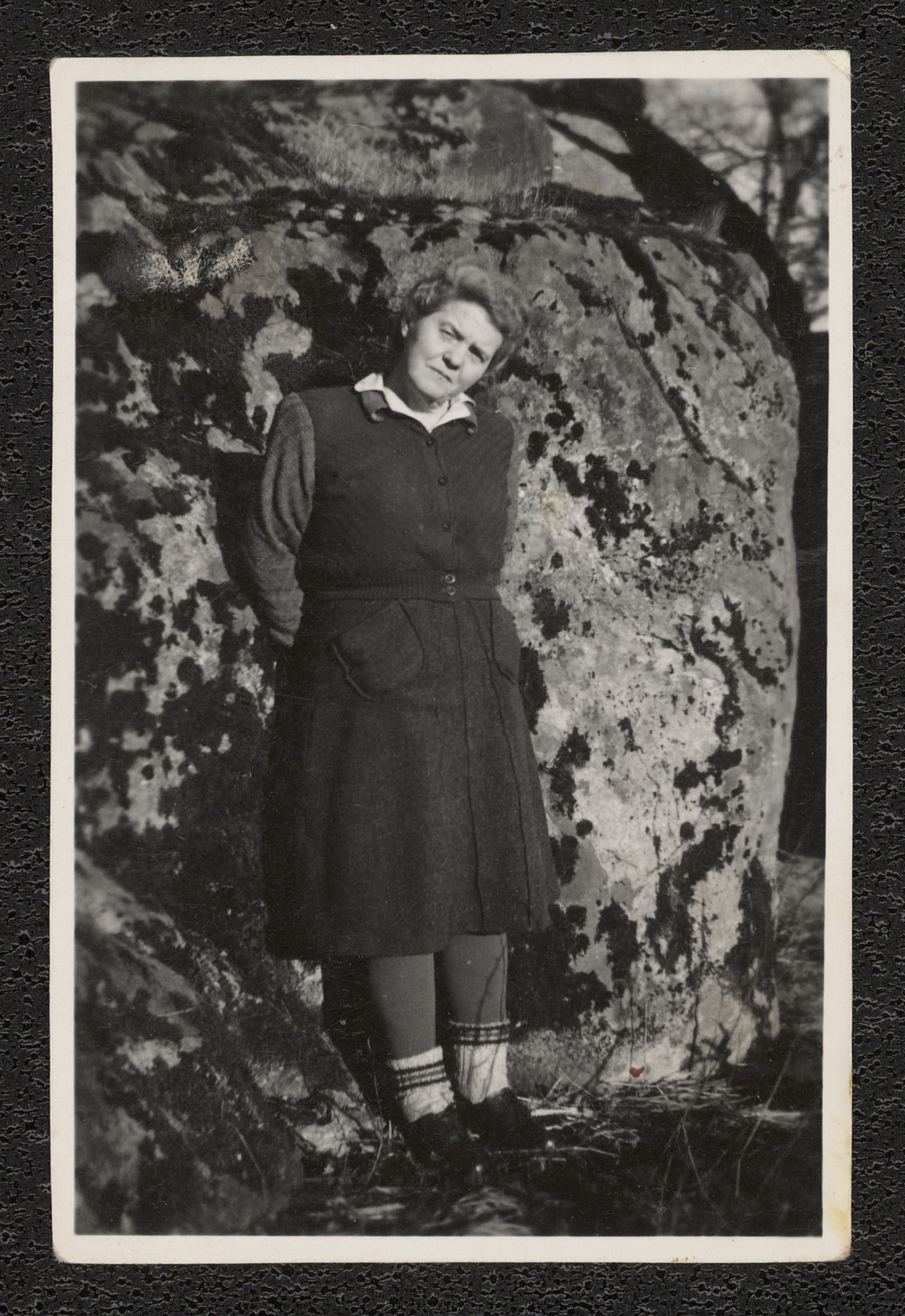 Alice Witt står framför en bergshäll. På baksidan finns texten "Alingsås 1946 (oläsl)"