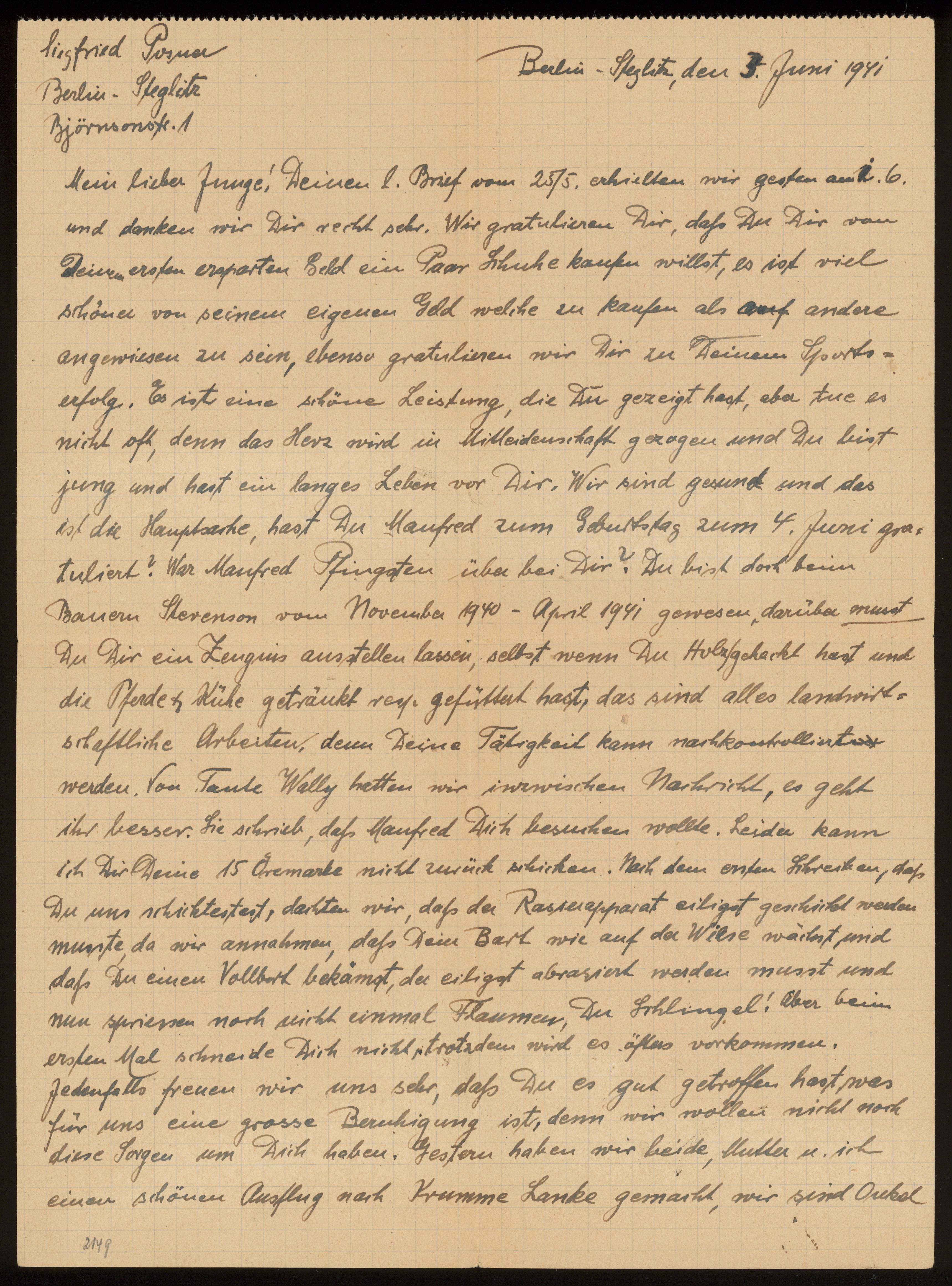 Brev från föräldrarna Anna och Siegfried Posner till sonen Ludwig Posner daterat 3 juni 1941.
