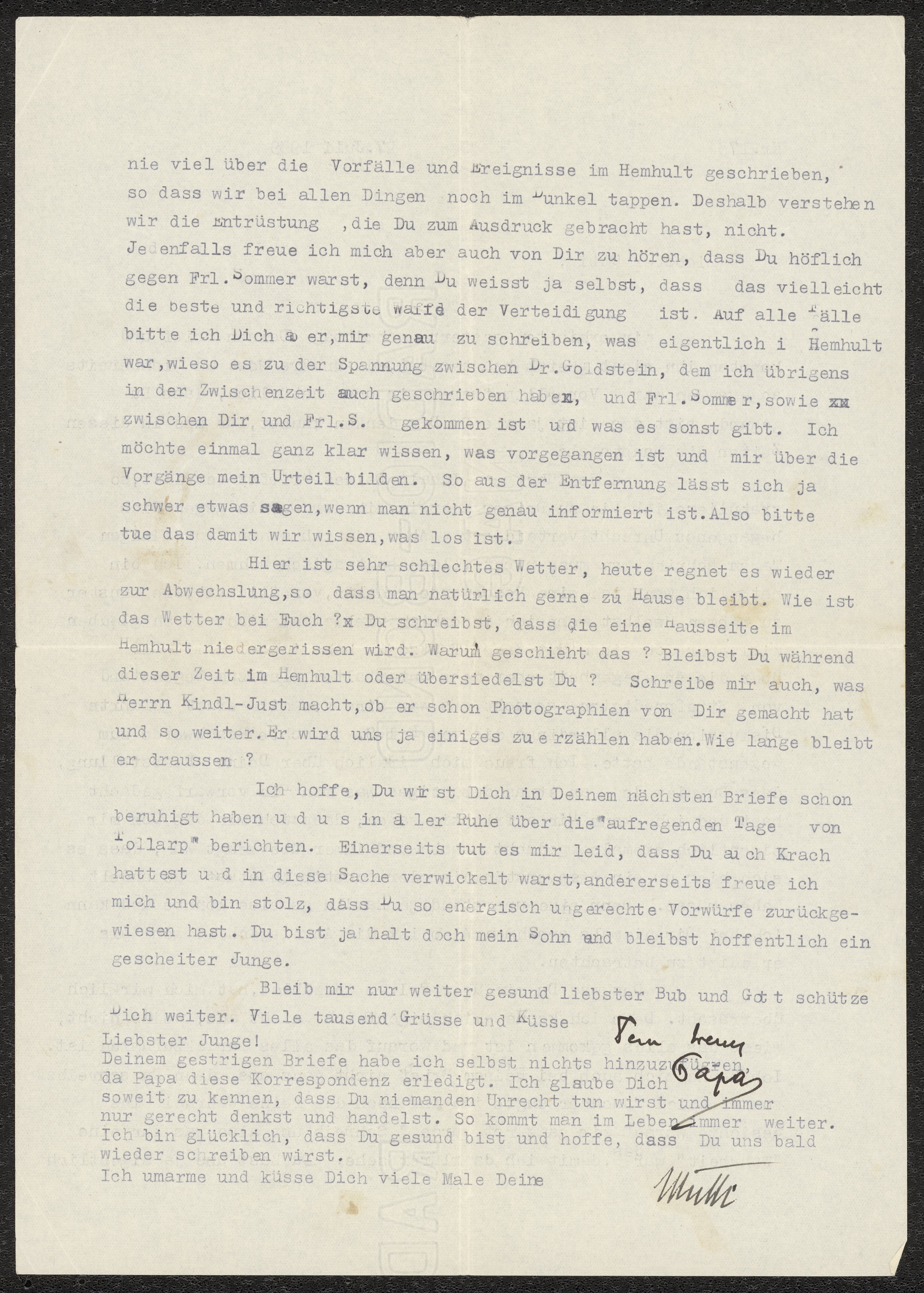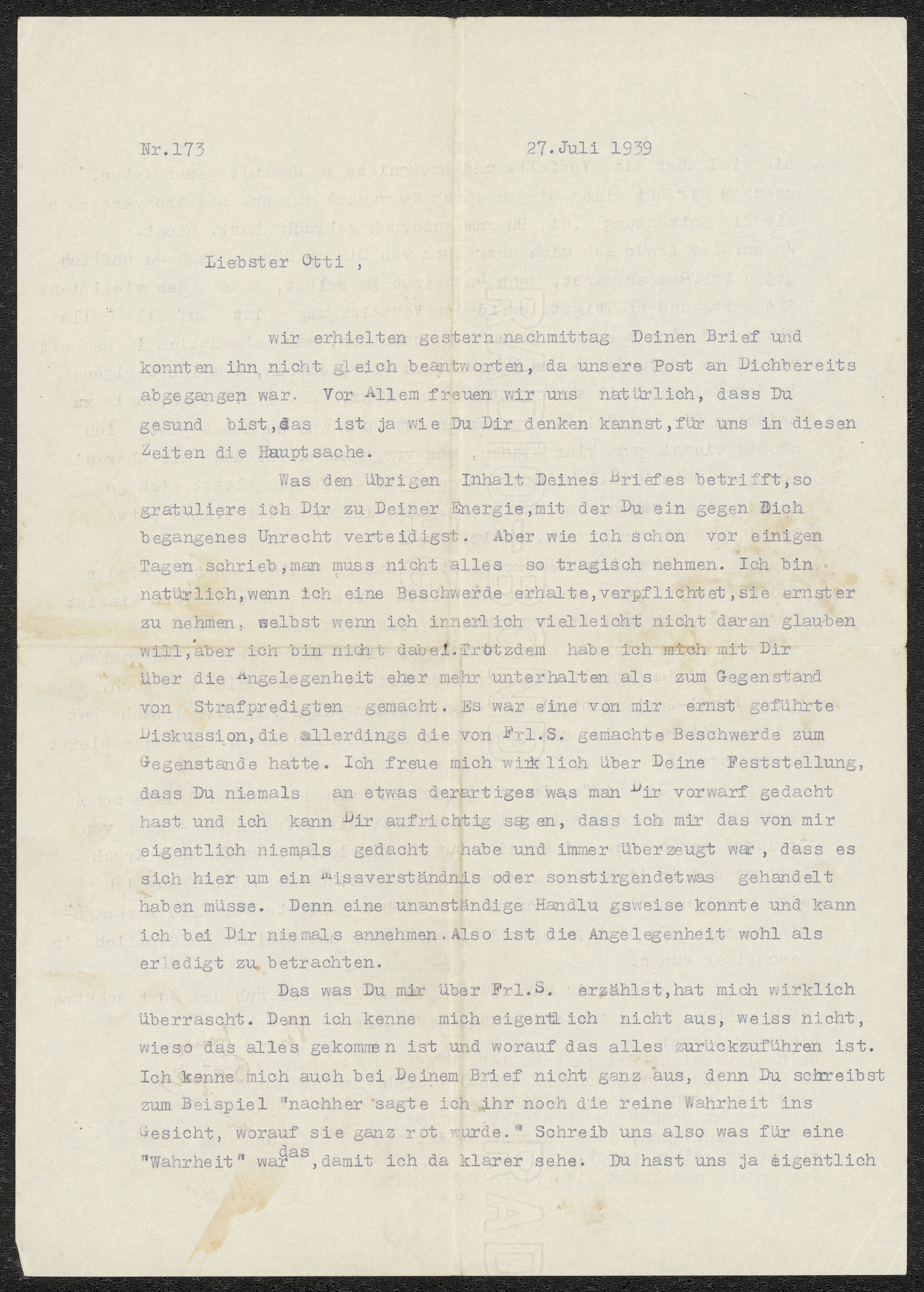 Maskinskrivet brev till Otto Ullman från föräldrarna Josef och Elise Ullmann daterat 27 juli 1939 Wien.