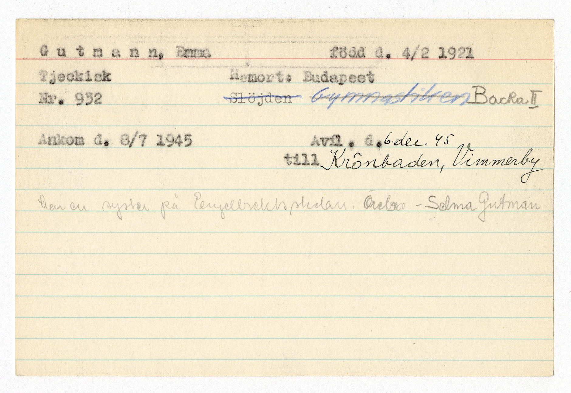 Ett skrivkort med patientuppgifter gällande Emma Gutmann.