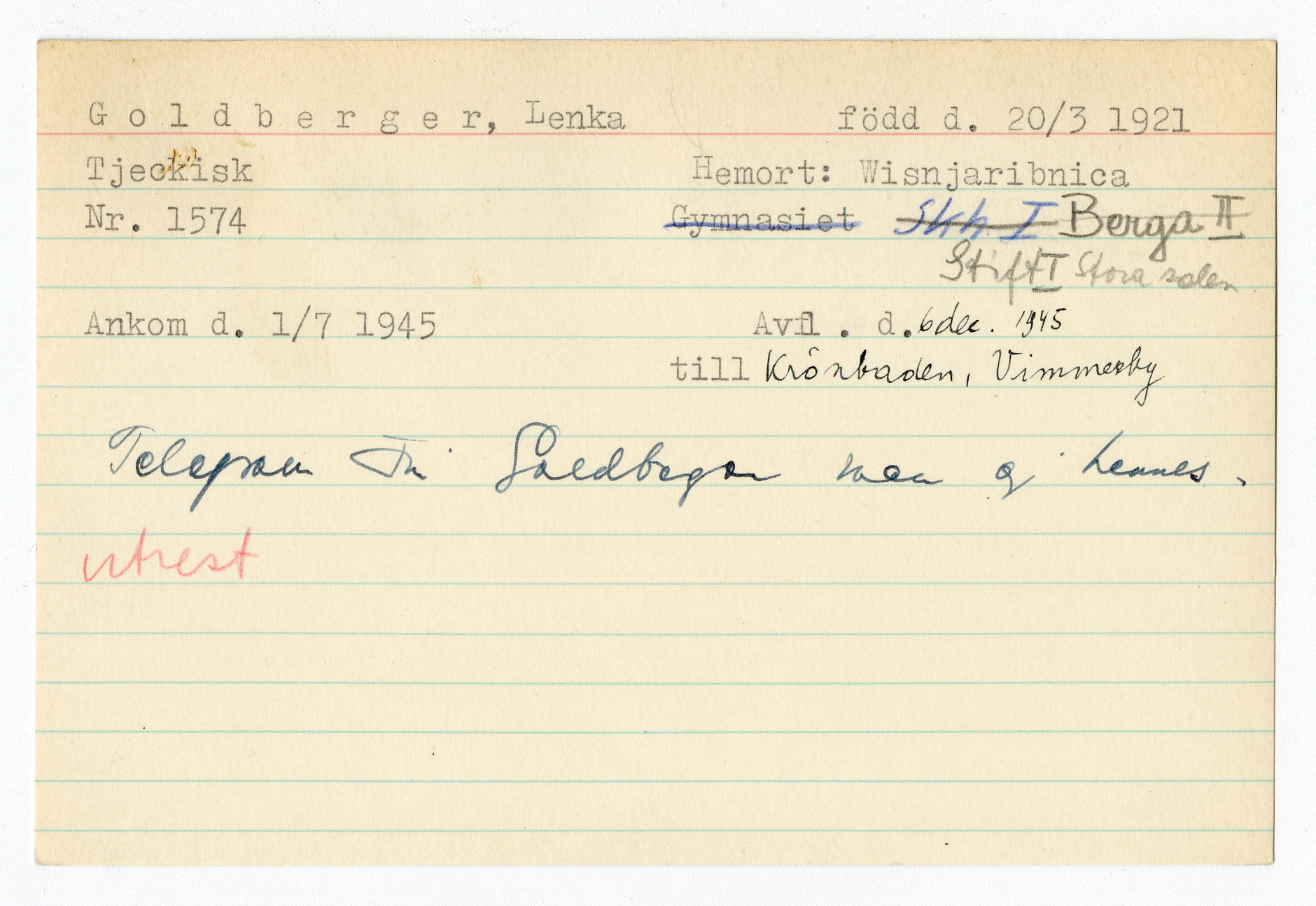 Ett skrivkort med patientuppgifter gällande Lenka Goldberger.