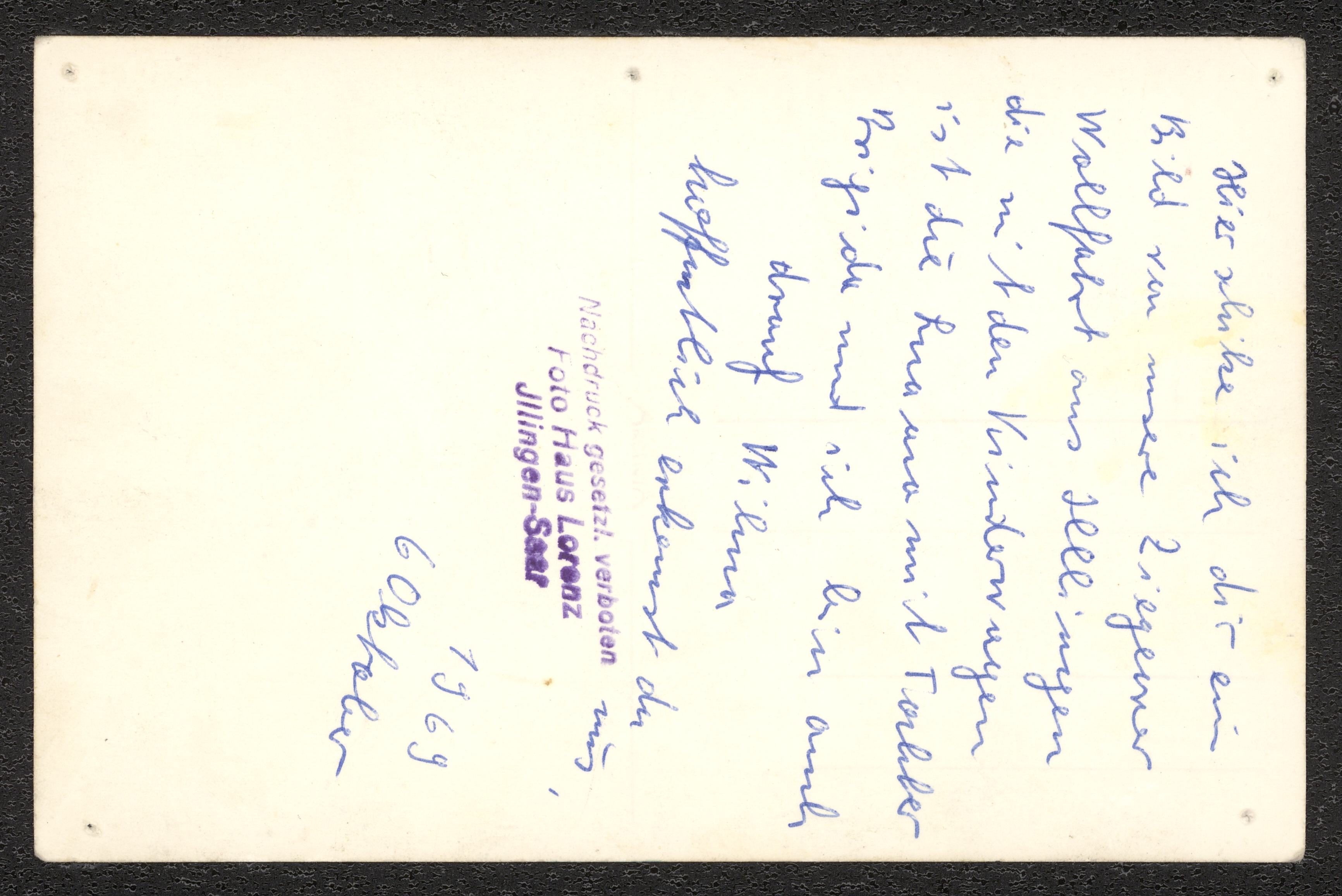 Fotografi föreställande procession i Illingen till minne av Arnold Fortuin. På baksidan hälsning på tyska skriven av (troligen) Eugen Friedrich.