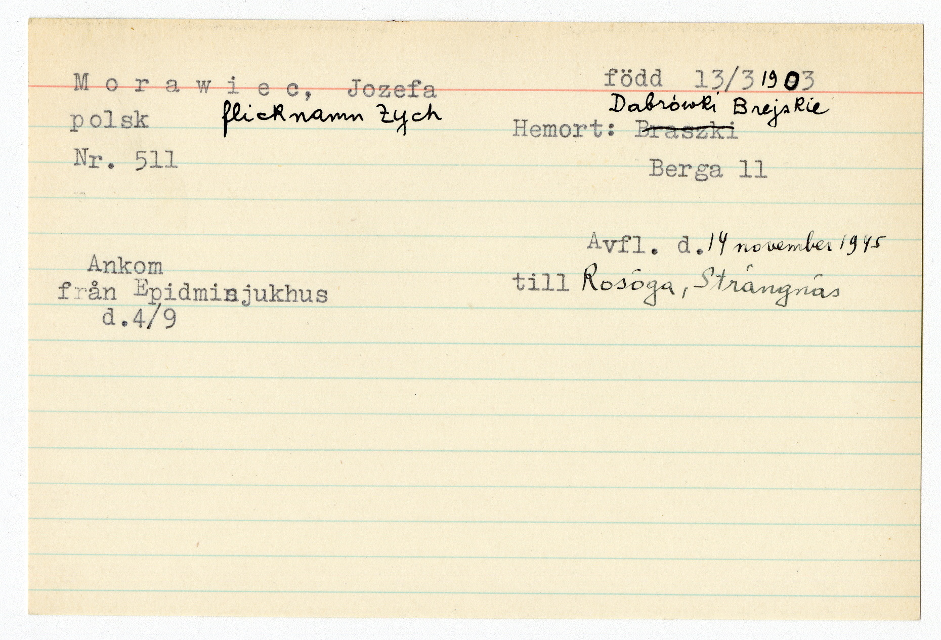 Ett skrivkort med patientuppgifter gällande Jozefa Morawiec f. Zych.