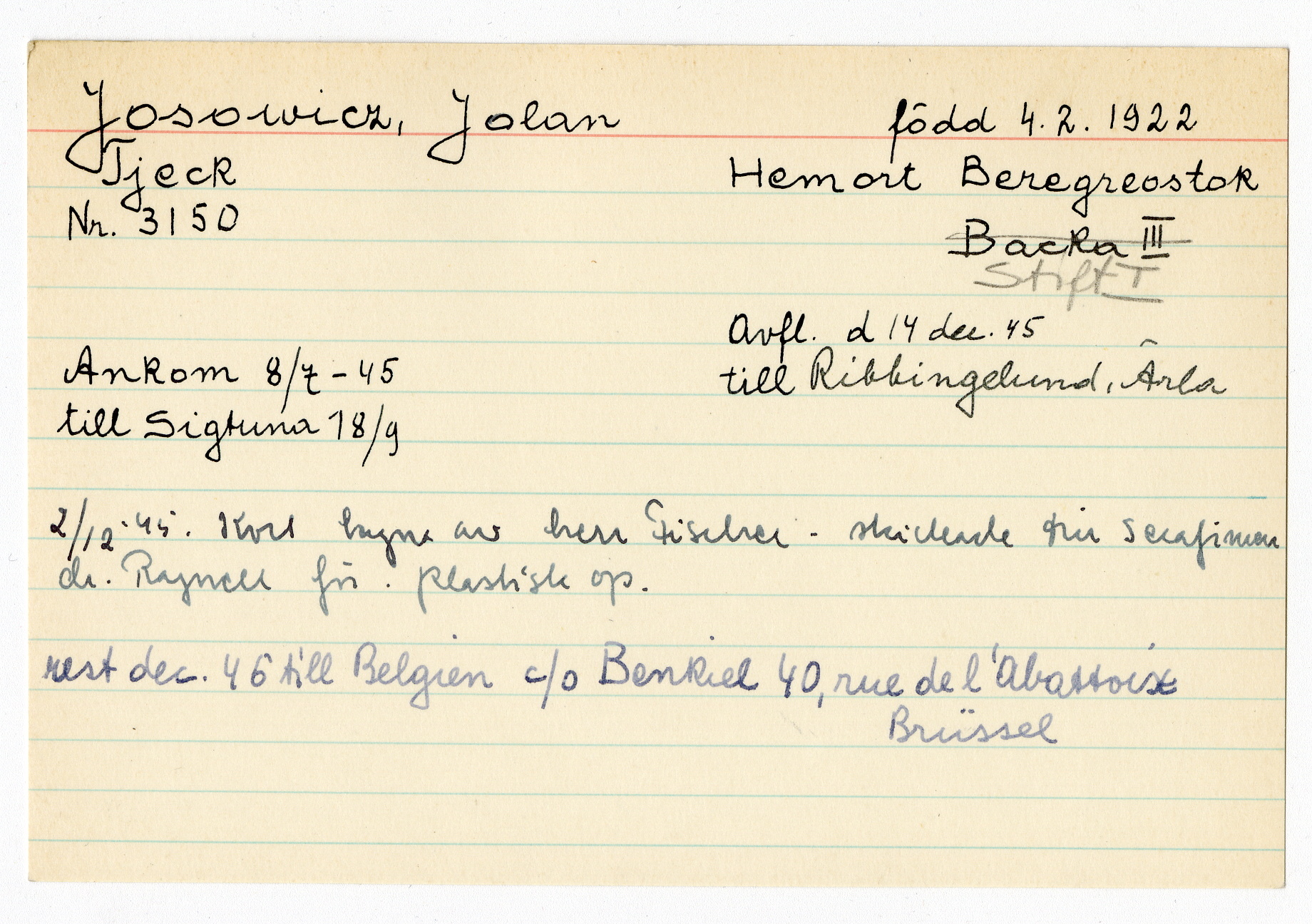 Ett skrivkort med patientuppgifter gällande Jolan Josowicz.