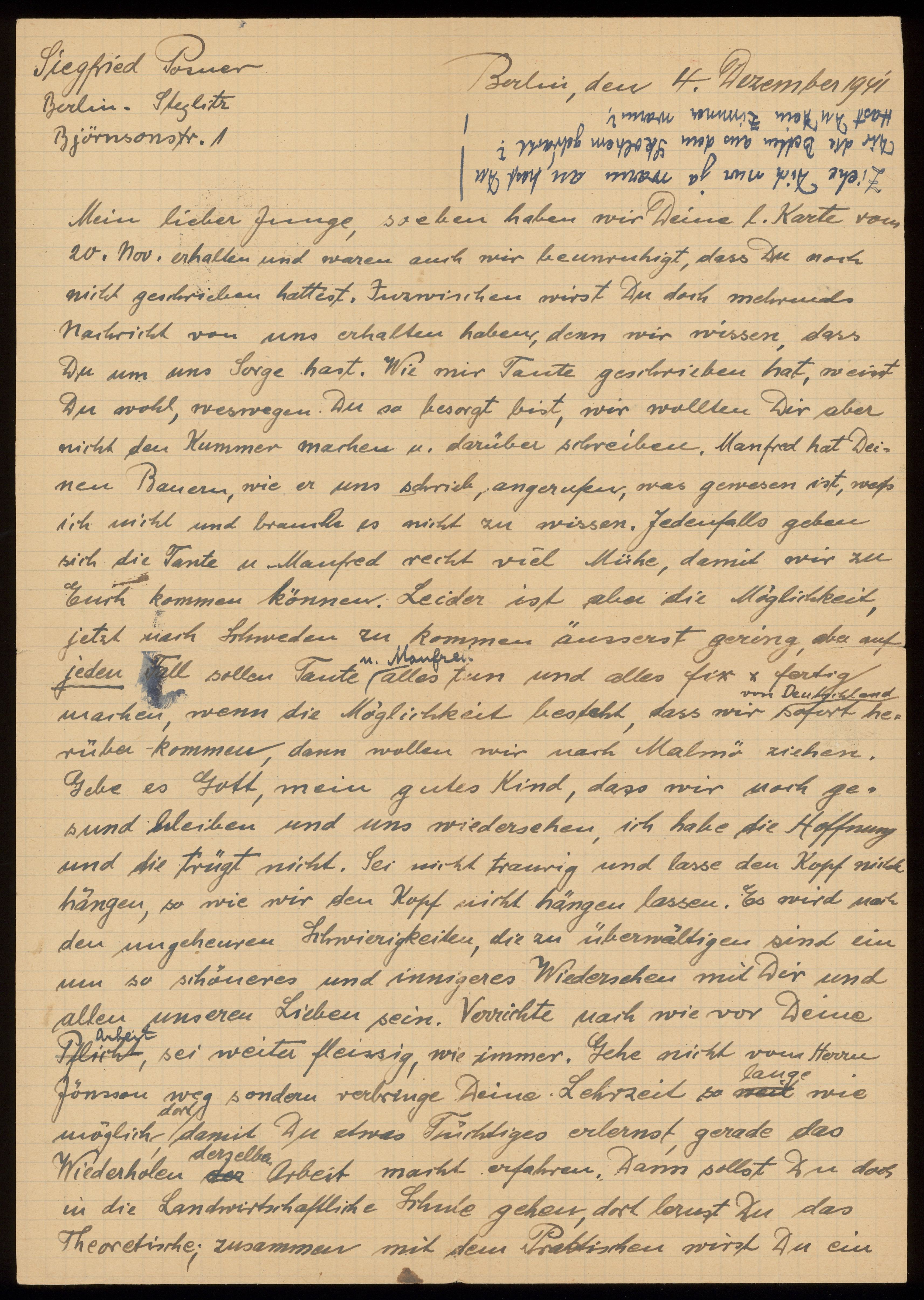 Brev från föräldrarna Anna och Siegfried Posner till sonen Ludwig Posner daterat 4 december 1941.