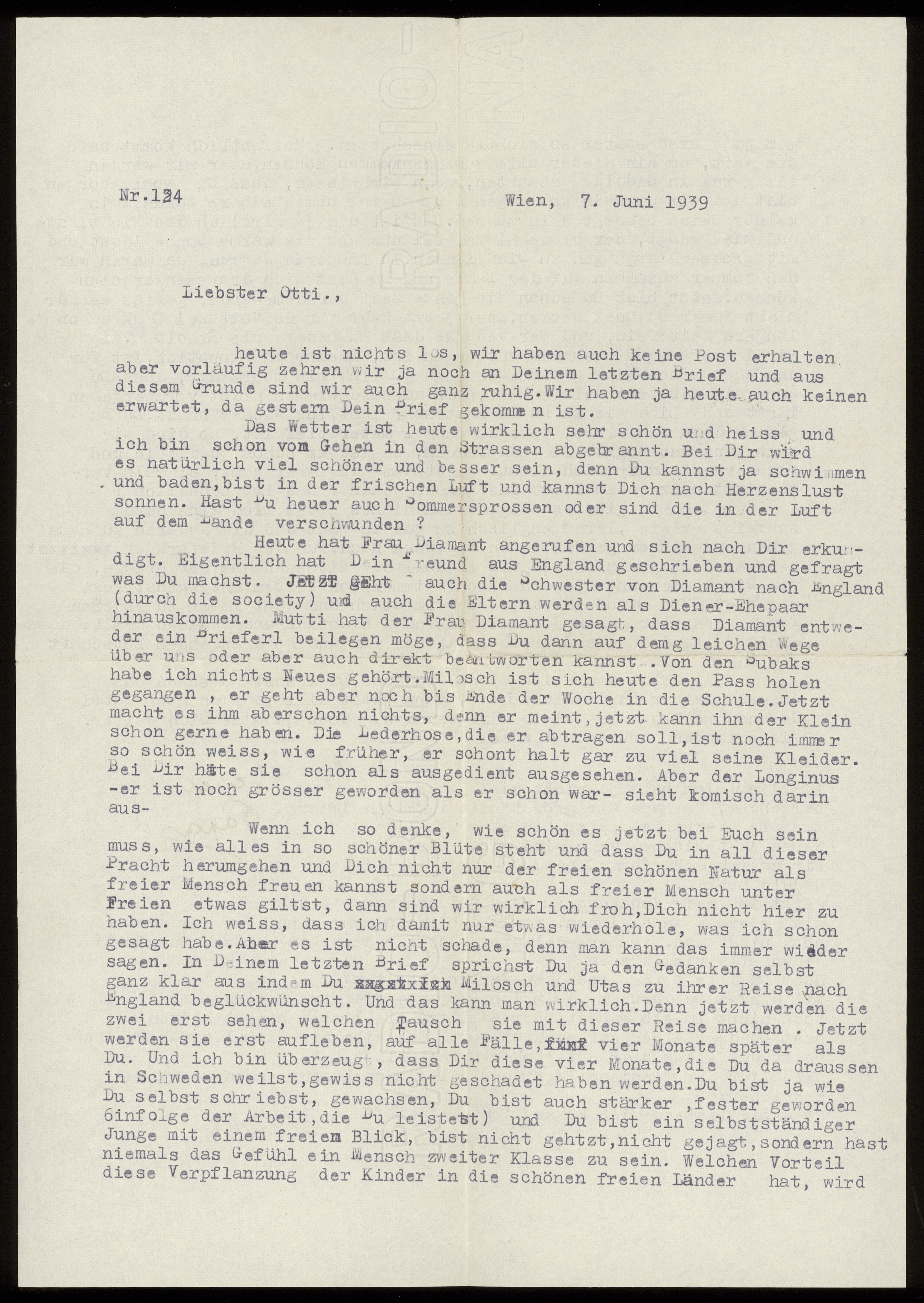 Maskinskrivet brev till Otto Ullman från föräldrarna Josef och Elise Ullmann daterat 7 juni 1939 Wien.