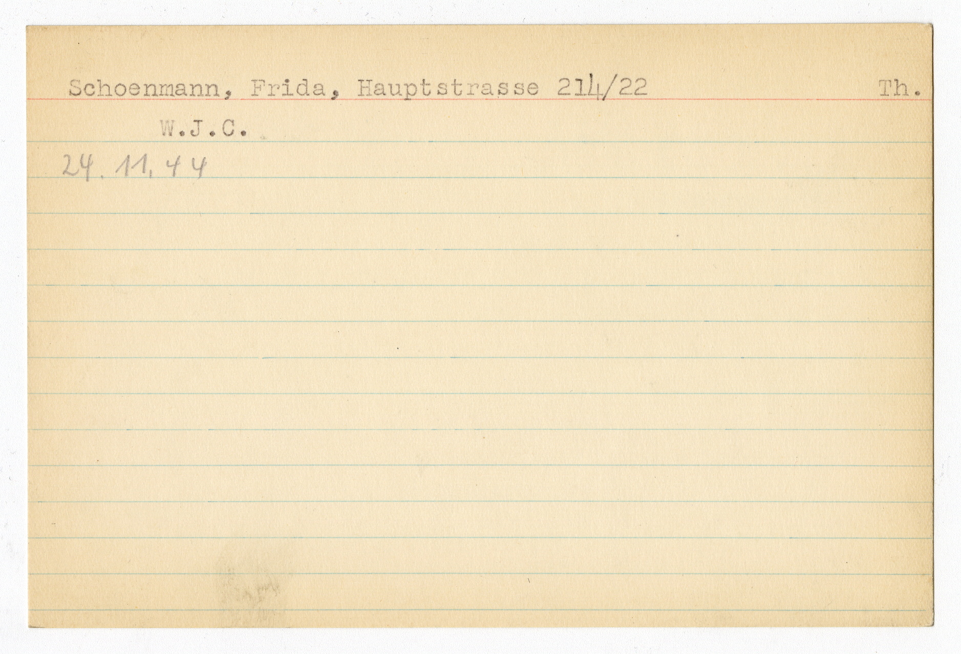 Ett skrivkort med patientuppgifter gällande Szeren Zoldan. På baksidan uppgifter om matpaket till Frida Schoenmann i Theresienstadt.