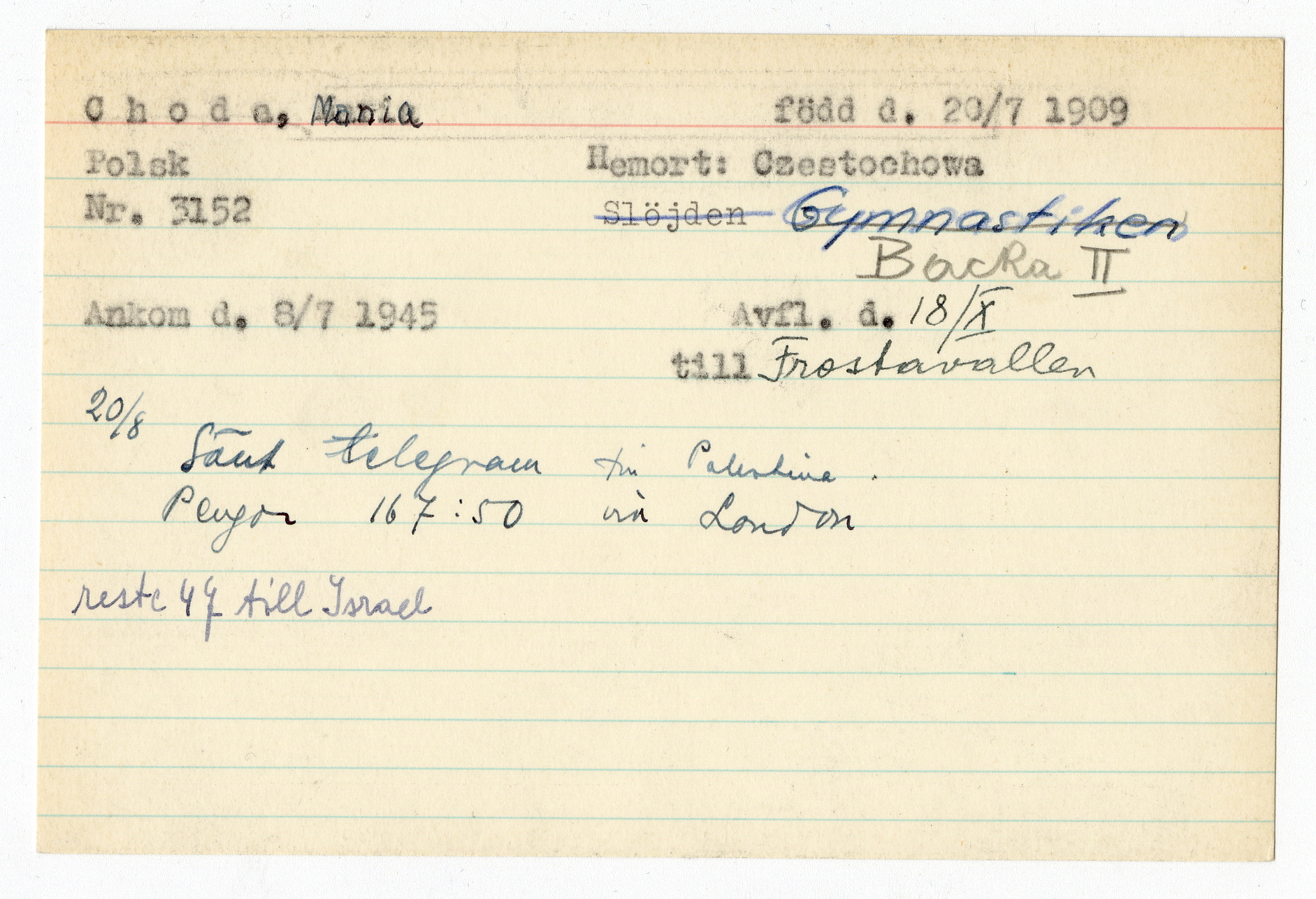 Ett skrivkort med patientuppgifter gällande Mania Choda.