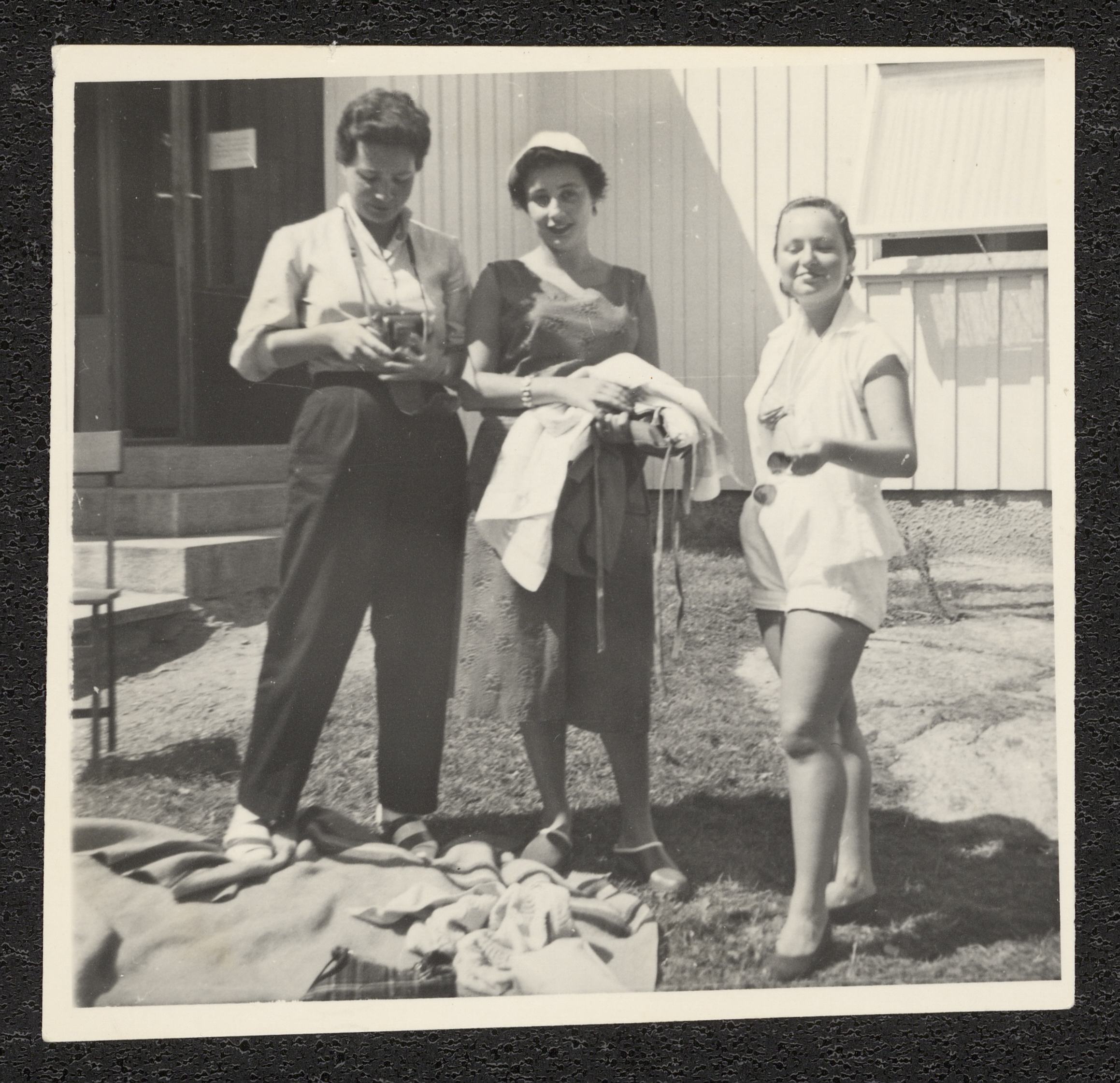 Tre sommarklädda kvinnor poserar för kameran. Kvinnan längst till vänster har en kamera i ett band runt halsen.