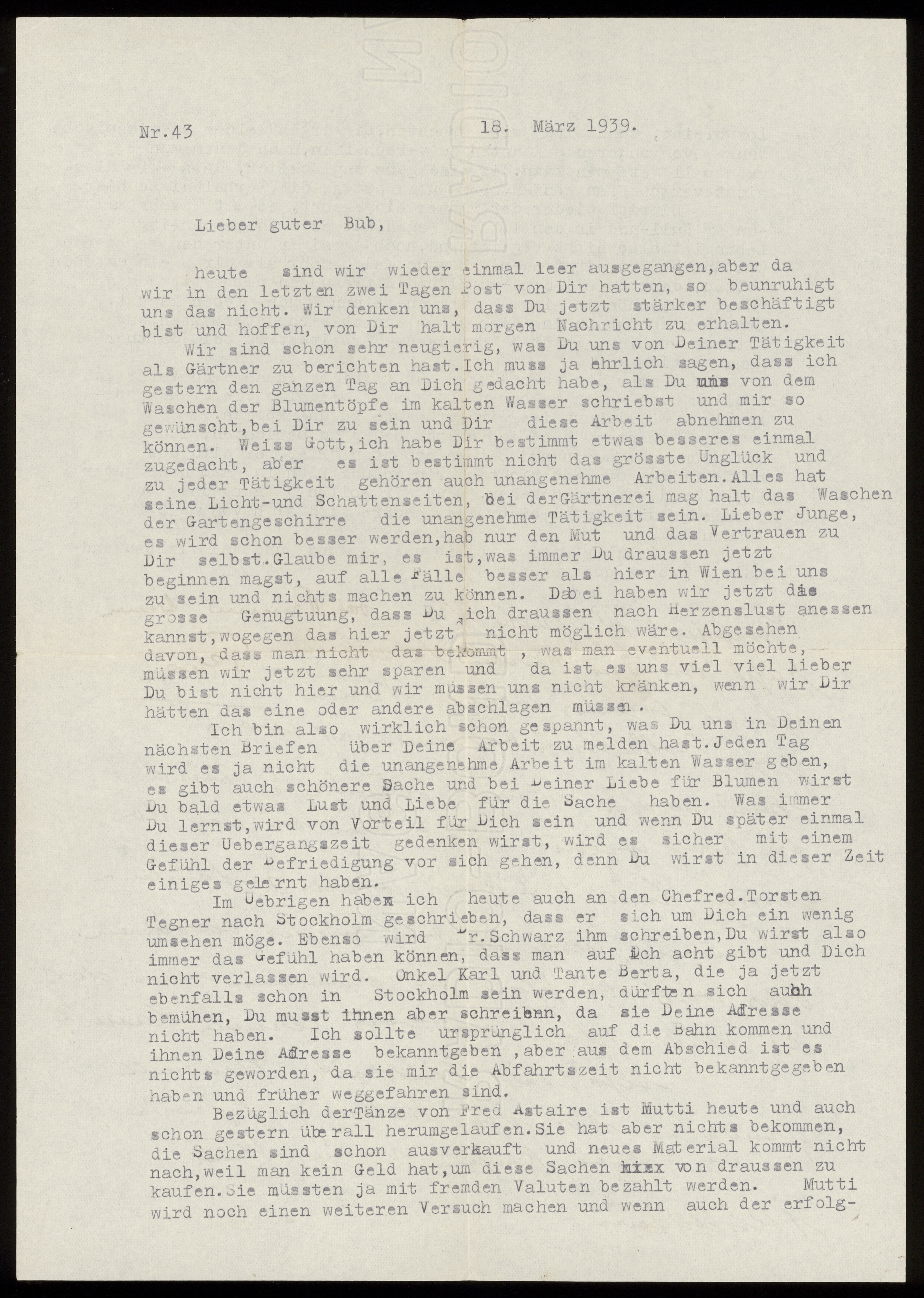 Maskinskrivet brev till Otto Ullman från föräldrarna Josef och Elise Ullmann daterat 18 mars 1939 Wien.