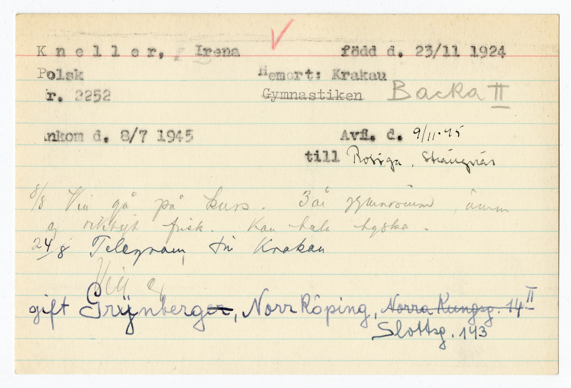 Ett skrivkort med patientuppgifter gällande Irena Kneller.