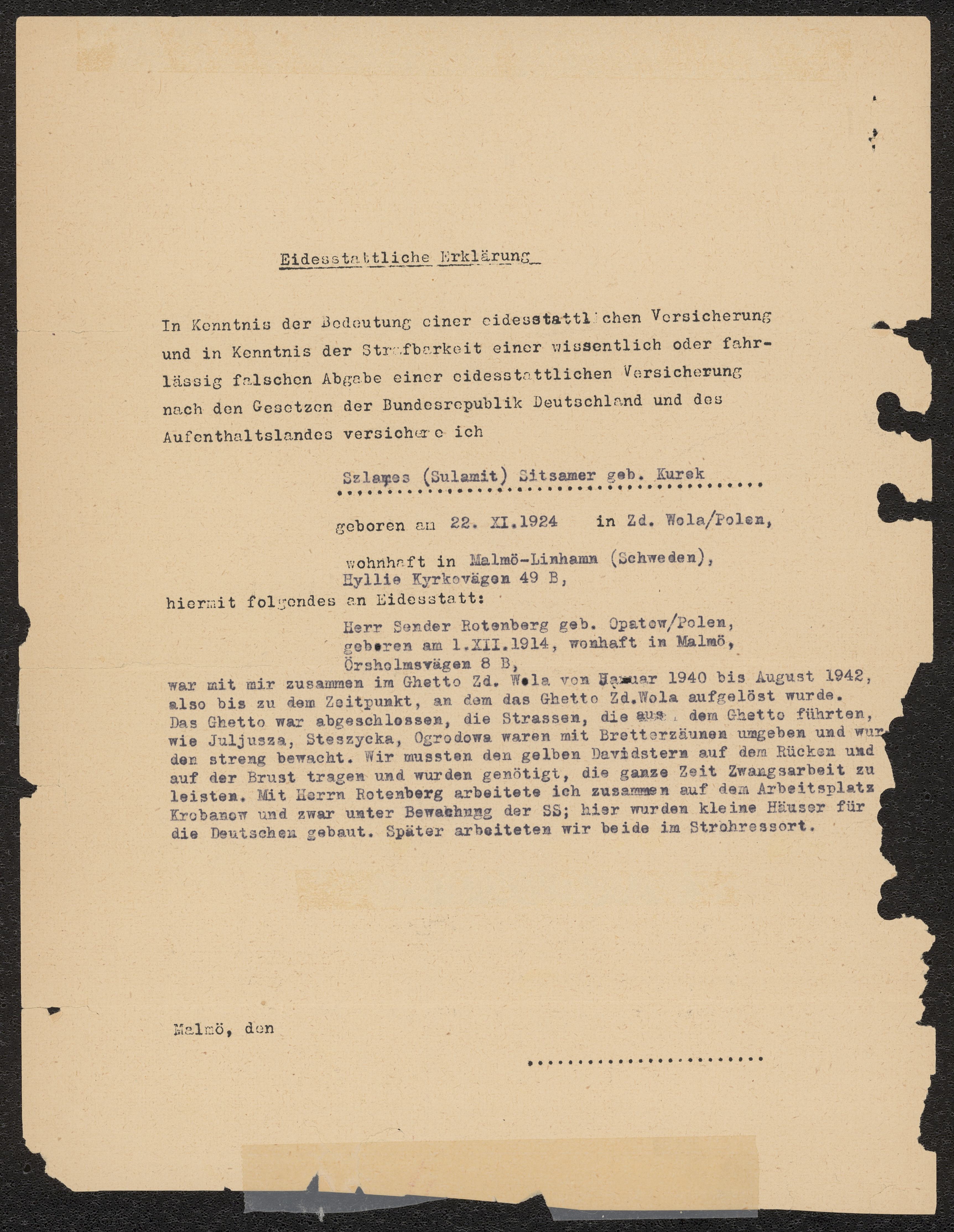 Intygande av Sulamit Sitsamer om att Sender Rotenberg var i Wola-gettot mellan 1940 och 1942
