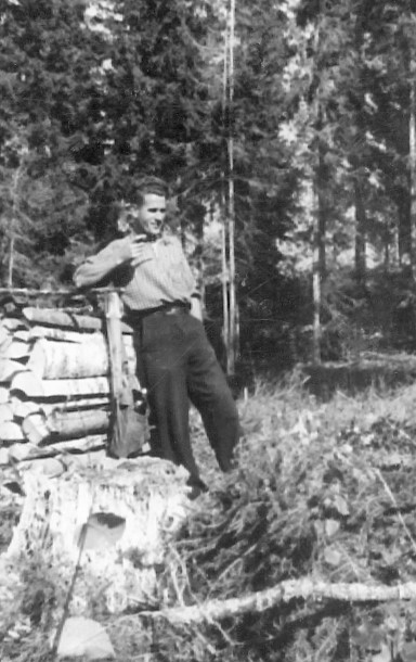 Józef Pastuszuk tar en paus i skogsarbetet som han och hans kollegor genomförde vid interneringen i Sverige under andra världskriget.