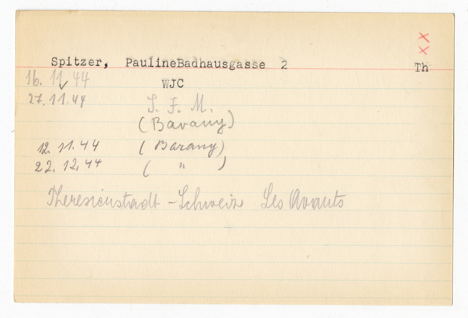 Ett skrivkort med patientuppgifter gällande Lea Jäger. På baksidan uppgifter om matpaket till Pauline Spitzer i Theresienstadt.