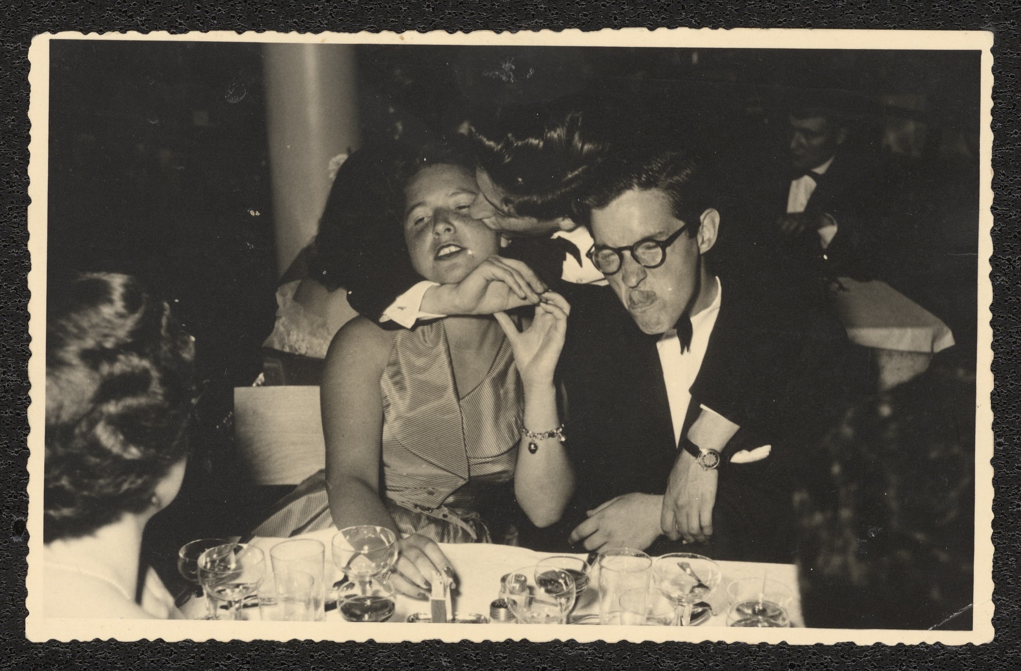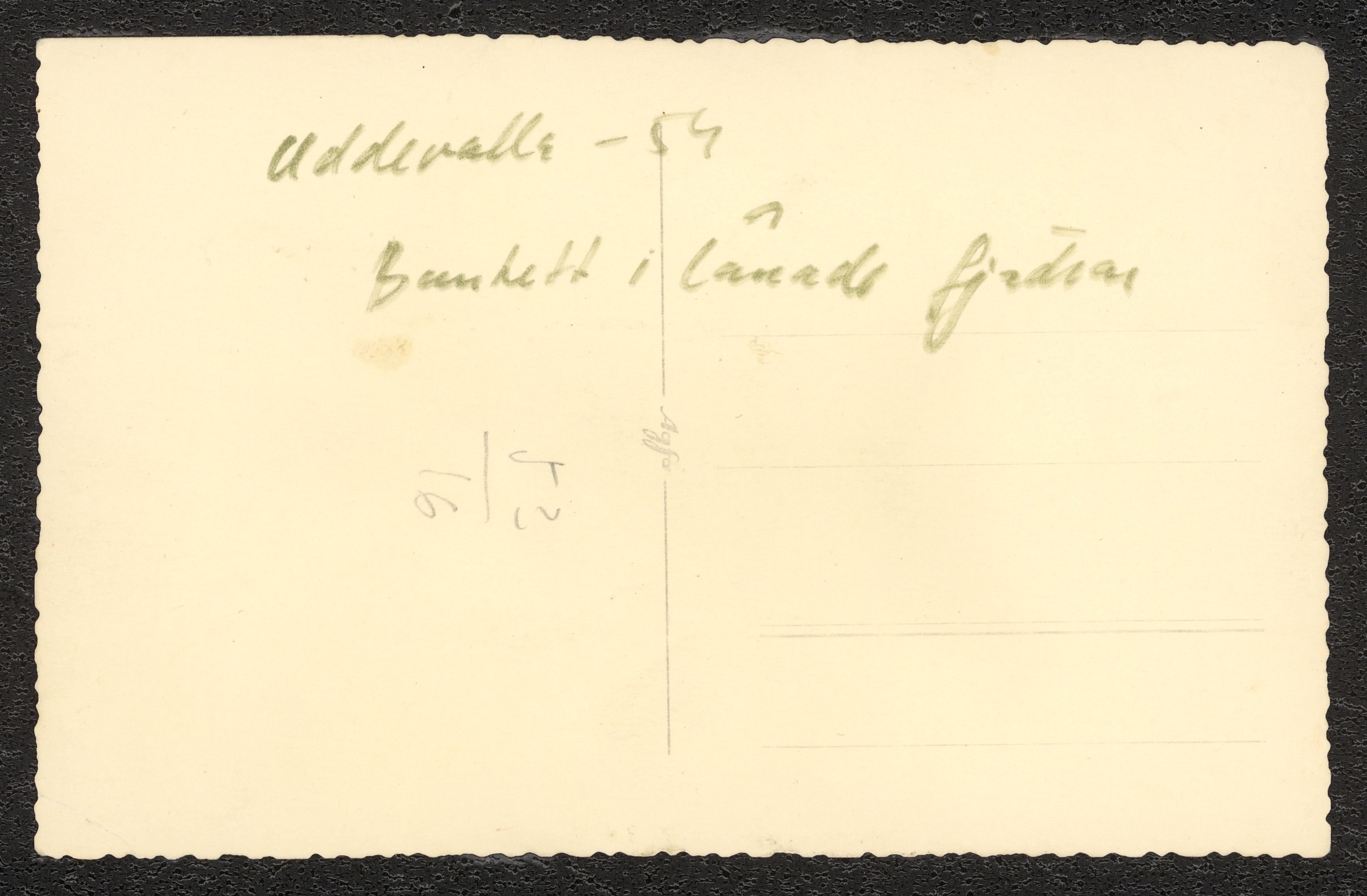 Tre personer vid ett middagsbord. På baksidan finns texten "Uddevalla -54 Bankett i lånade fjädrar".