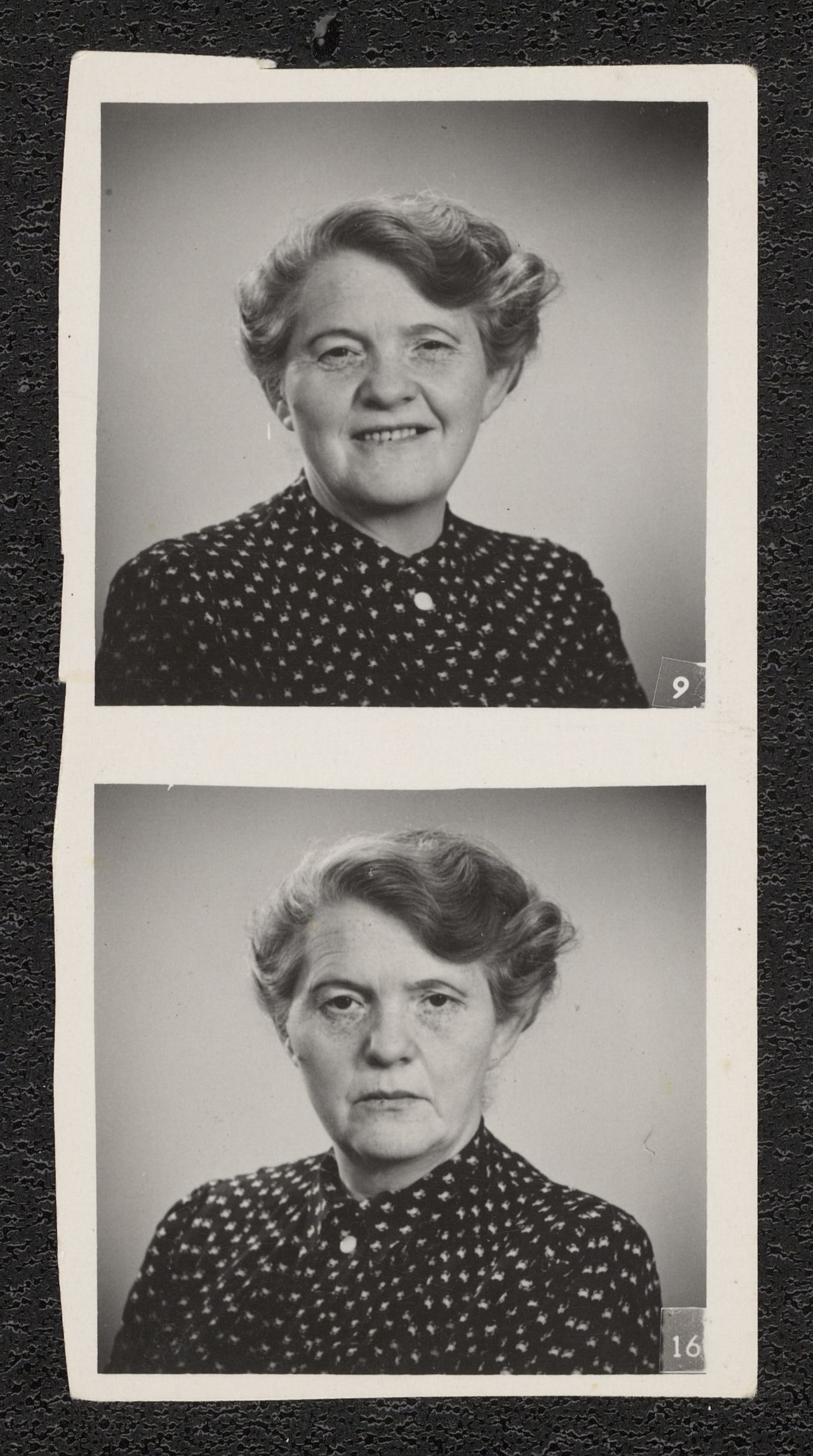 Två fotografier från (troligen) en fotokarta med fler bilder, föreställande Alice Witt. På den ena bilden ler hon, på den andra ser hon allvarlig ut.