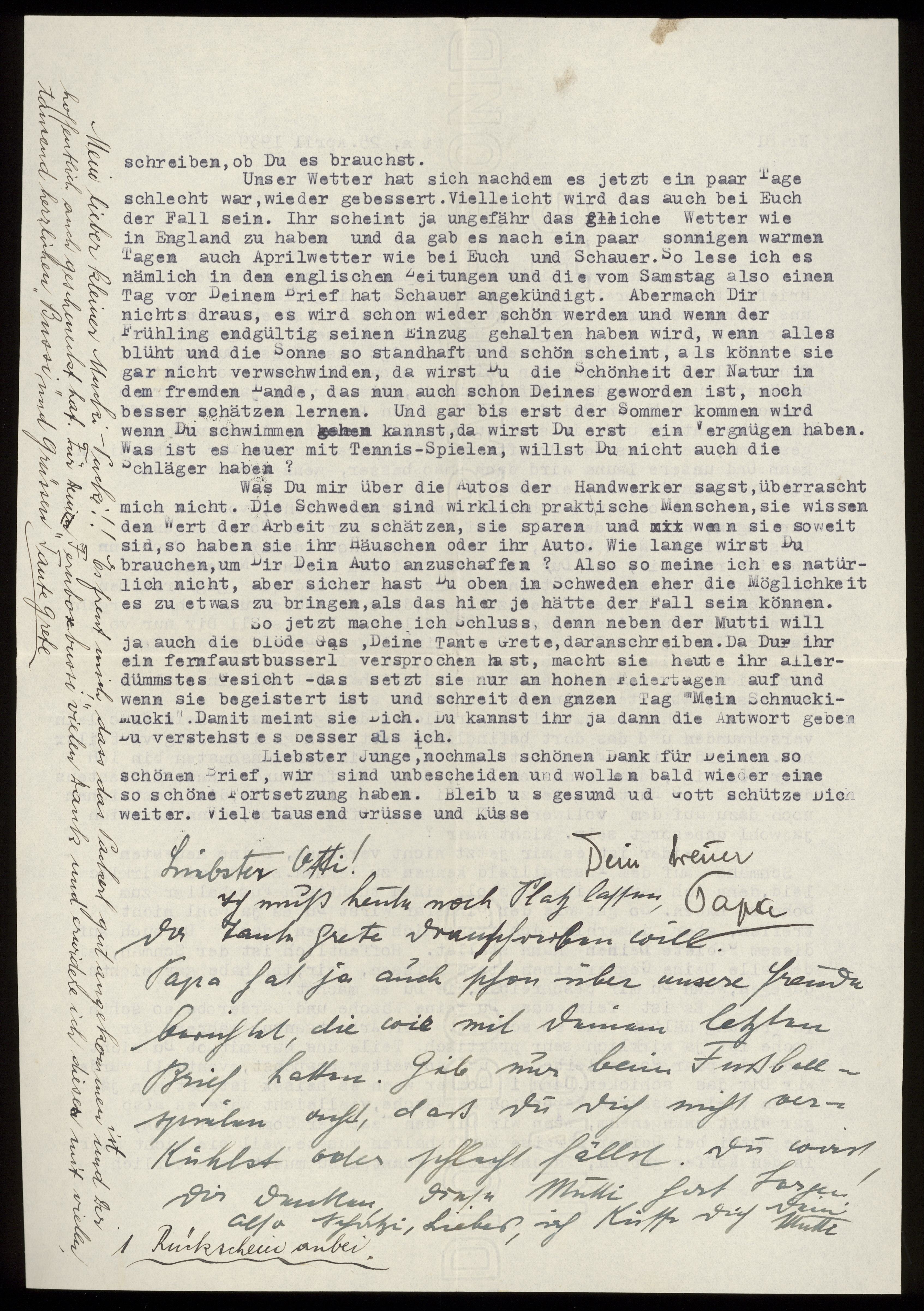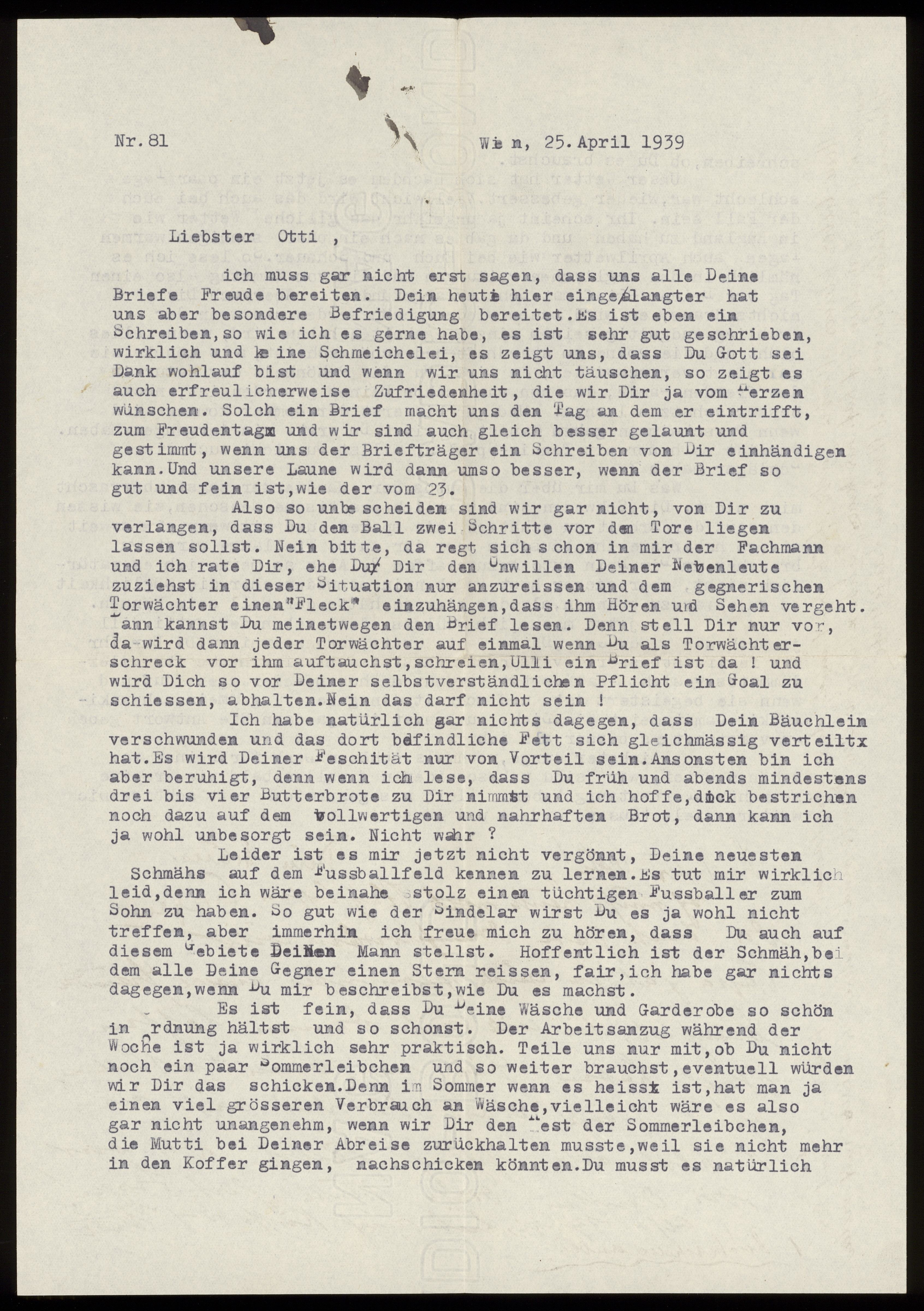 Maskinskrivet brev till Otto Ullman från föräldrarna Josef och Elise Ullmann och moster Grete Kollmann daterat 25 april 1939 Wien.