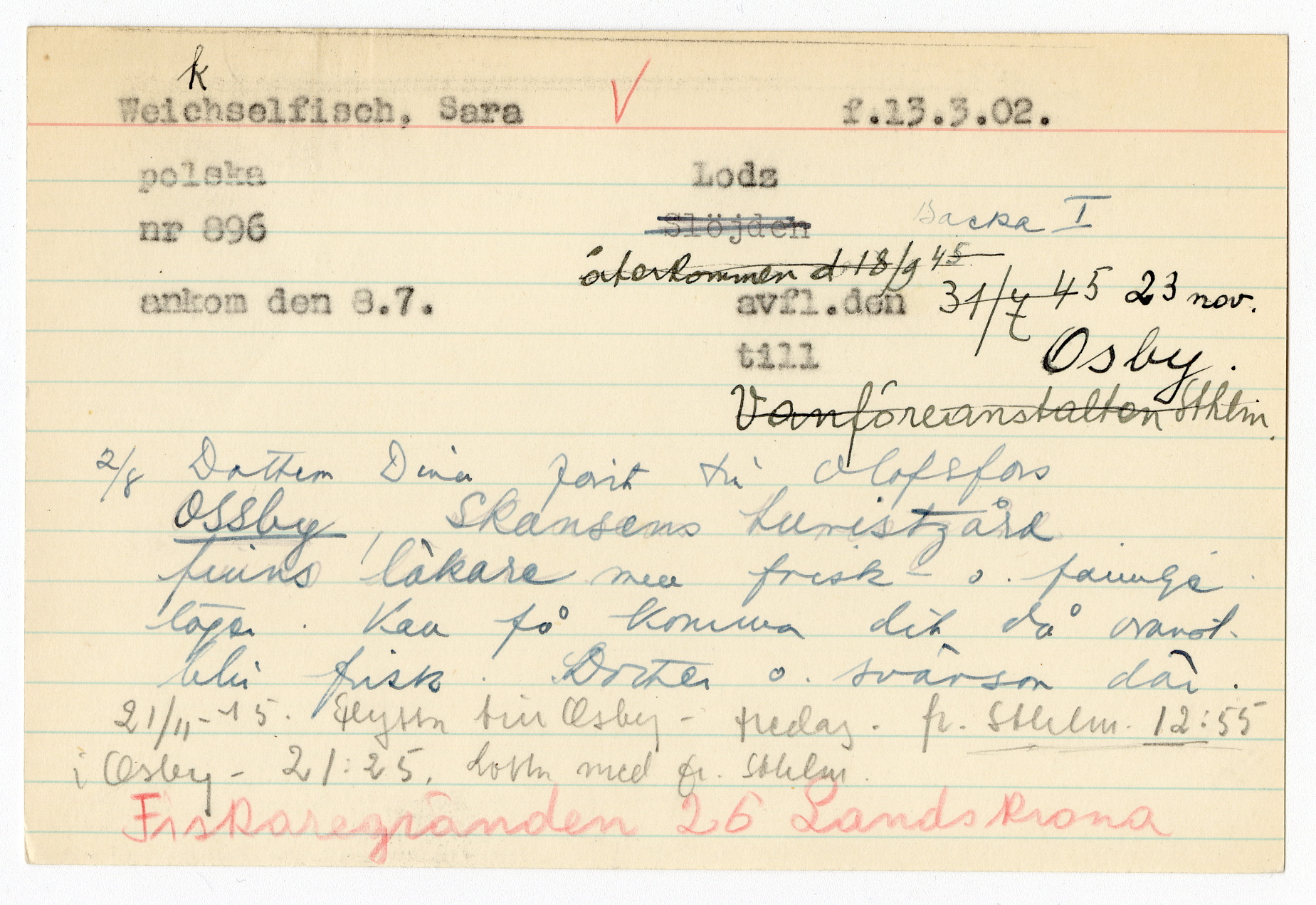 Ett skrivkort med patientuppgifter gällande Sara Weikselfisch.