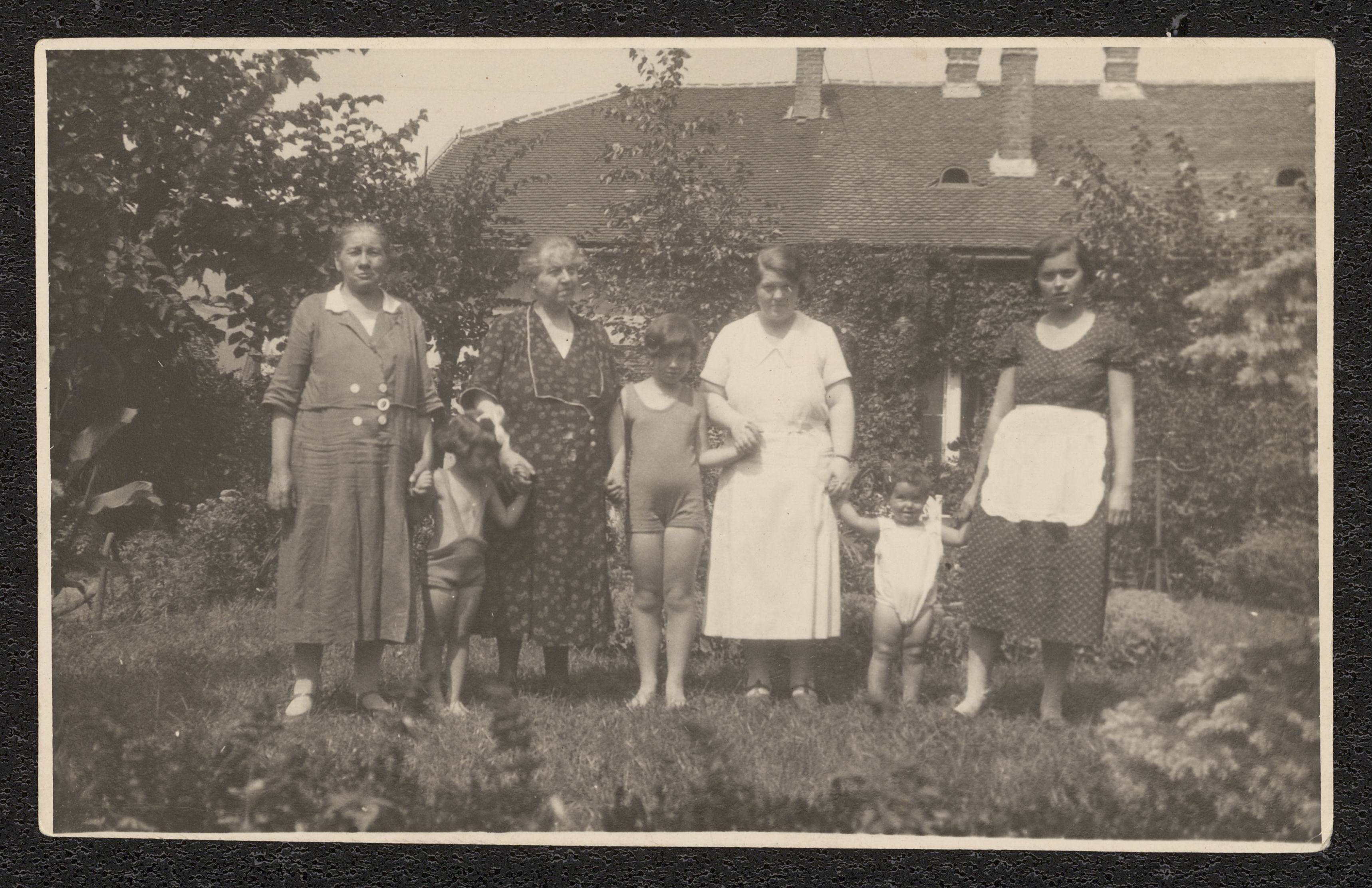 Gruppfotografi föreställande Georg Witts familj i trädgården i Újpest innan kriget. Georg Witt är troligen den andre från höger.