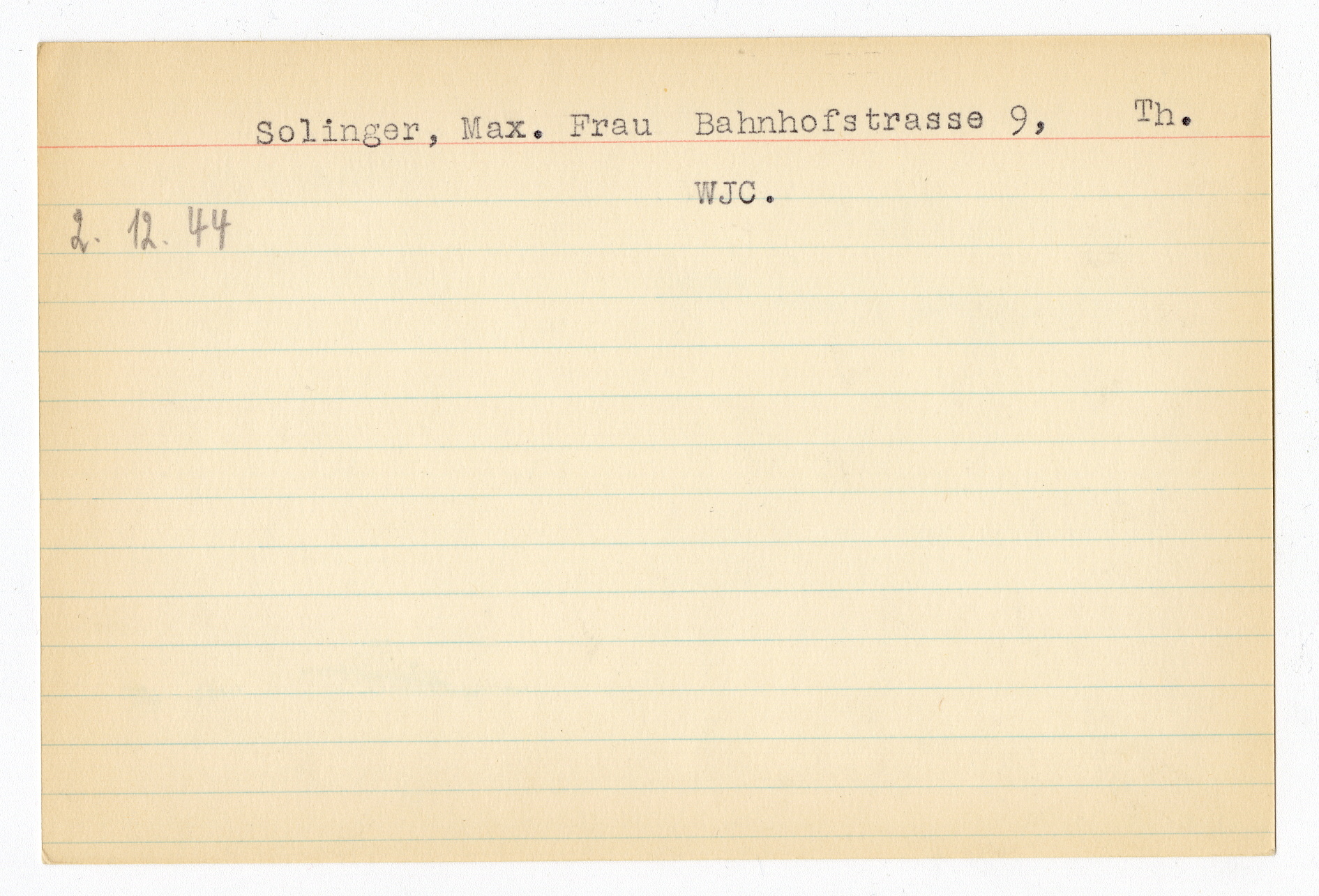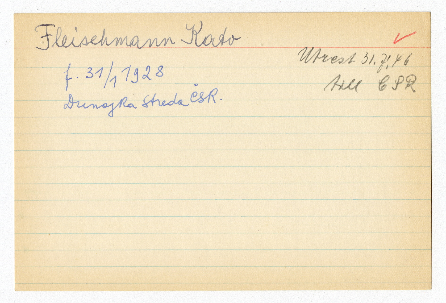 Ett skrivkort med patientuppgifter gällande Kato Fleischmann. På baksidan uppgifter om matpaket till Max Solinger i Theresienstadt.